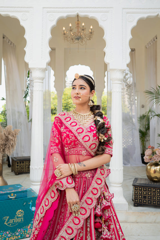 Bridal Lehenga - Hot Pink Silk Peacock Aari Zardozi | Wedding Lehenga
