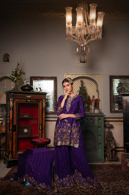 Violet Crepe Sharara Set with Zardozi Sequins Kardana and Thread Work