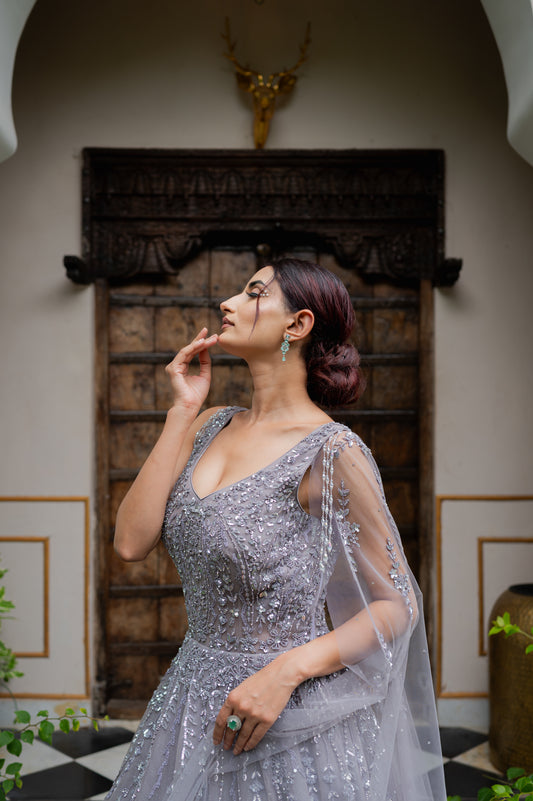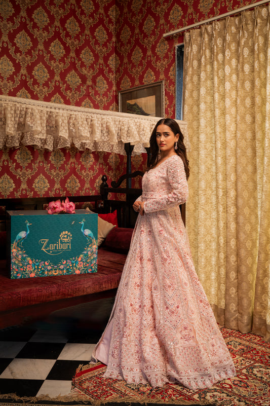 Indo Western Gown - Light Pink Net Sequins Thread | Designer Gown