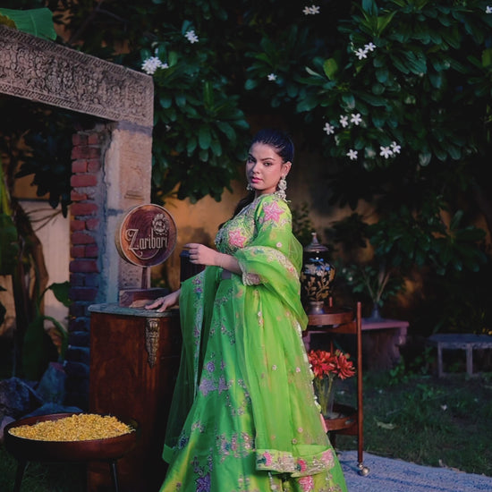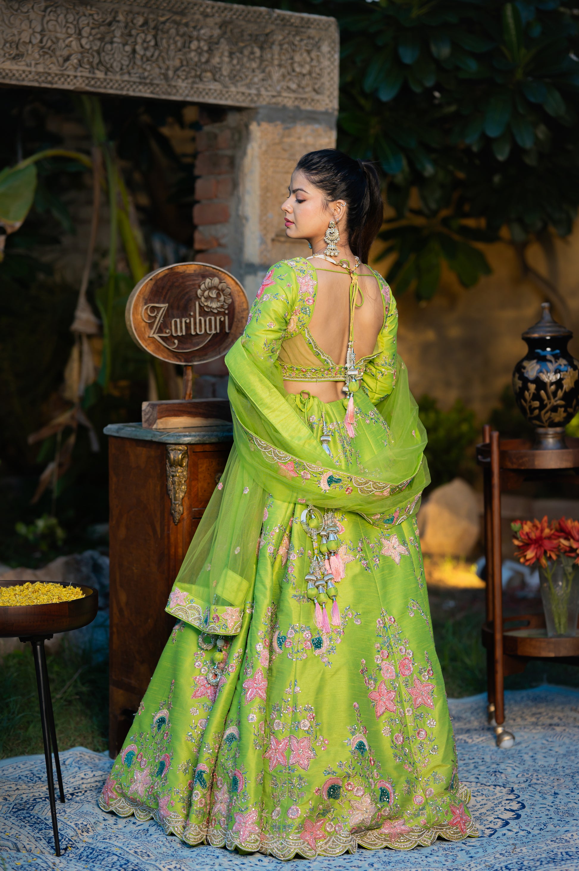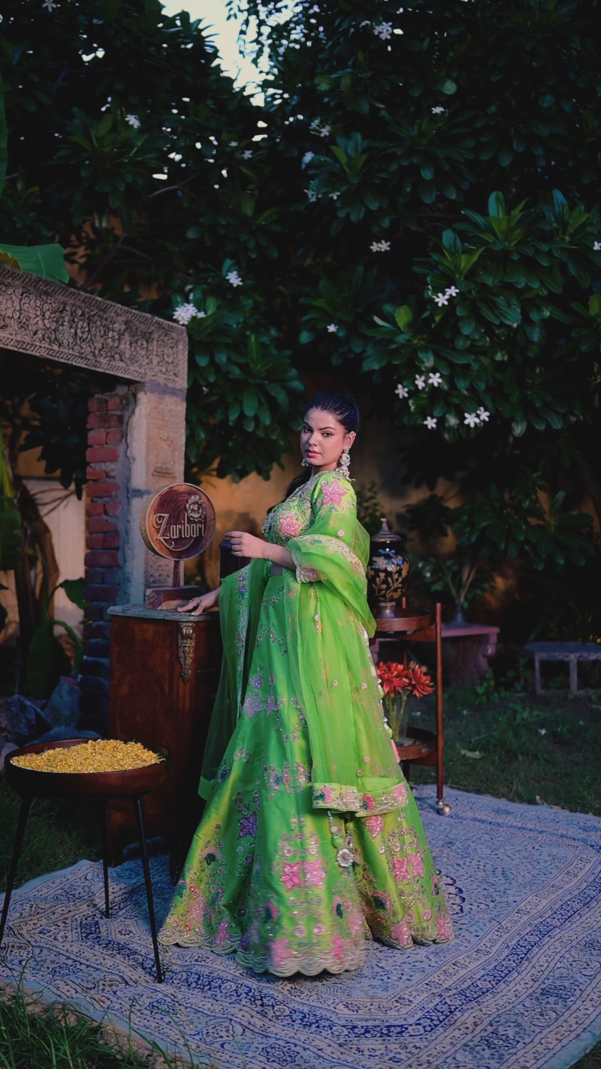 Crafted from luxurious raw silk, the lehenga offers a beautiful texture and an elegant drape. The unique avocado green hue is a subtle yet striking alternative to traditional colors, offering a fresh, contemporary look. The entire ensemble is beautifully adorned with intricate hand-done Aari, sequins, and moti work, creating a dazzling effect that catches the light with every move. This lehenga set is a true work of art, designed to make you feel effortlessly graceful and radiant on your special day.