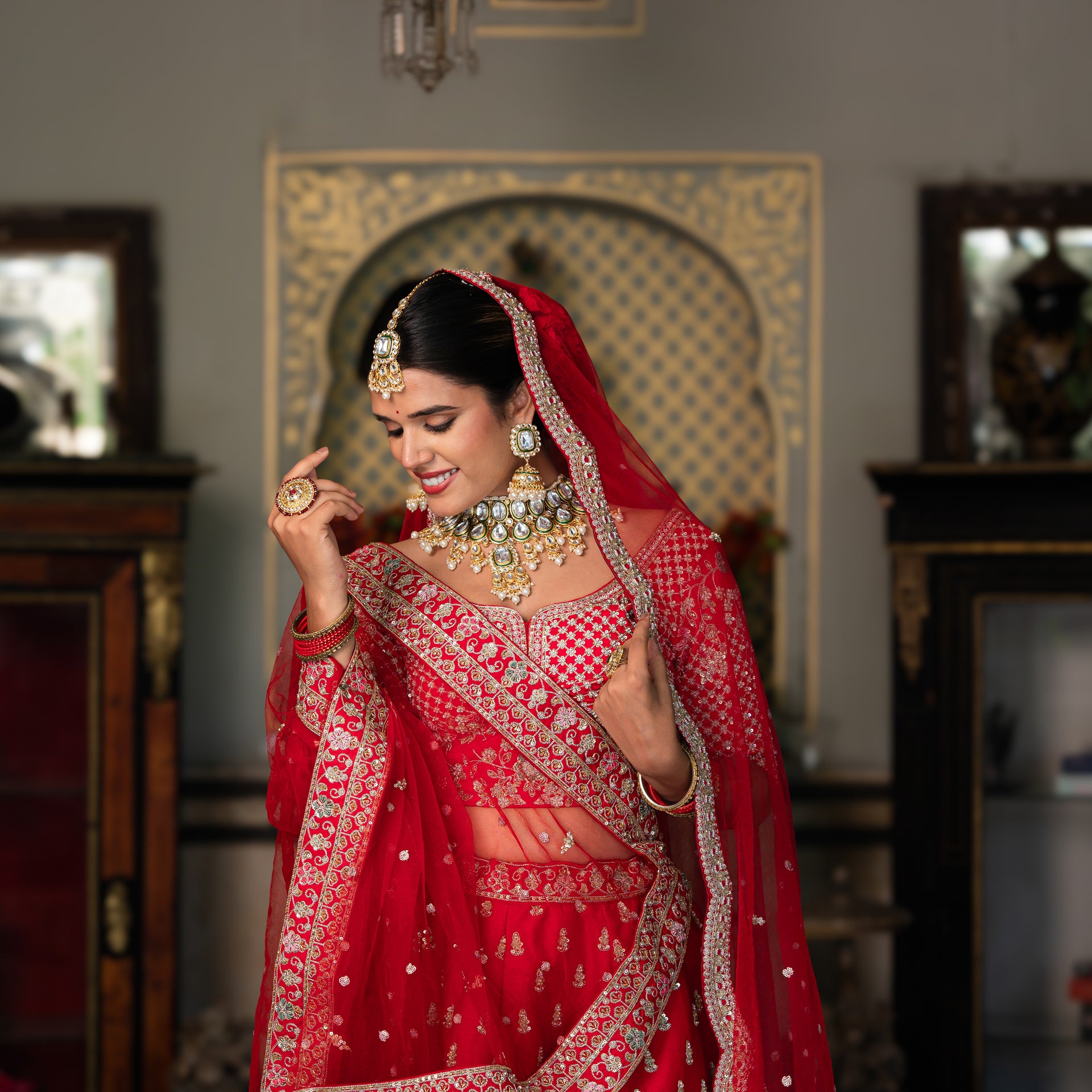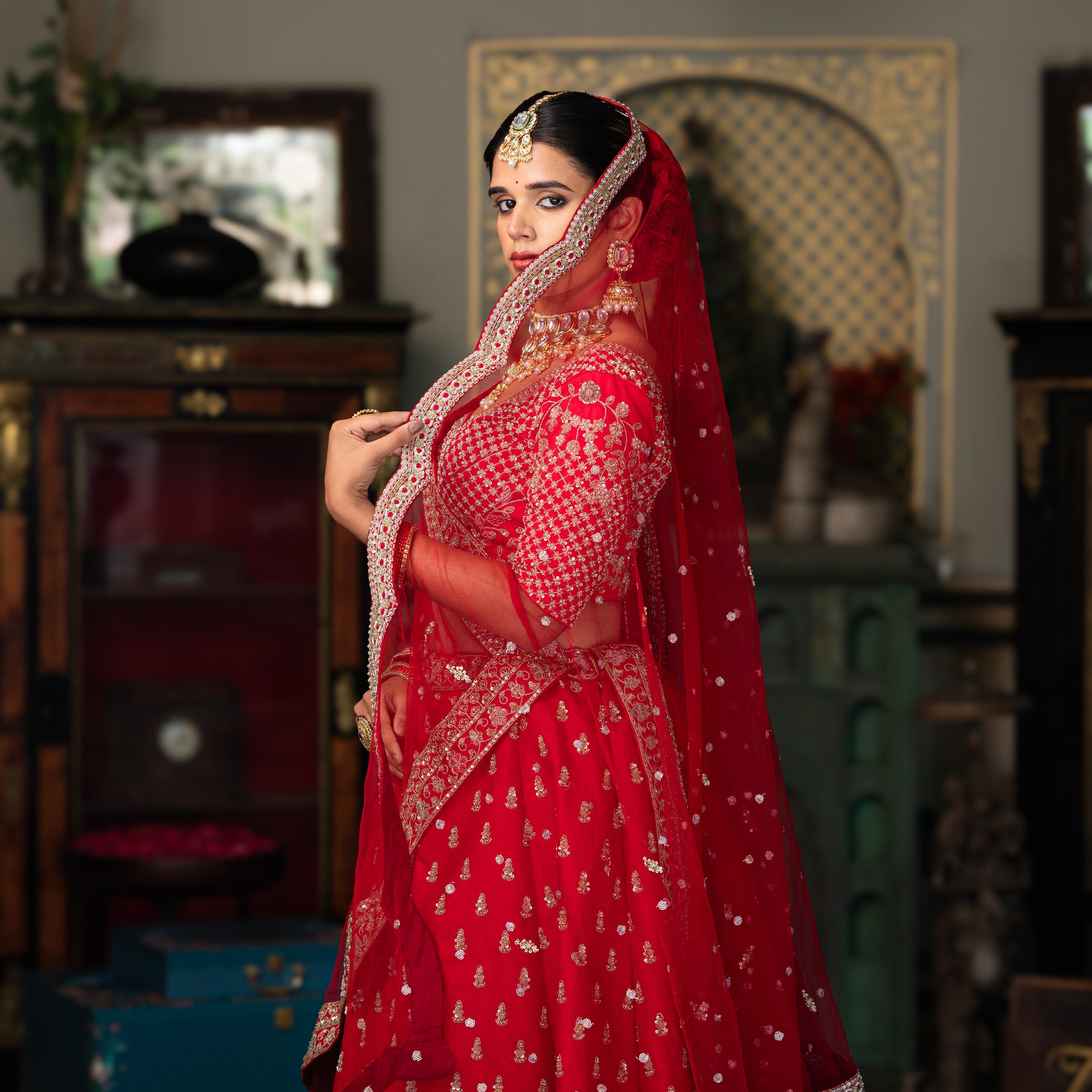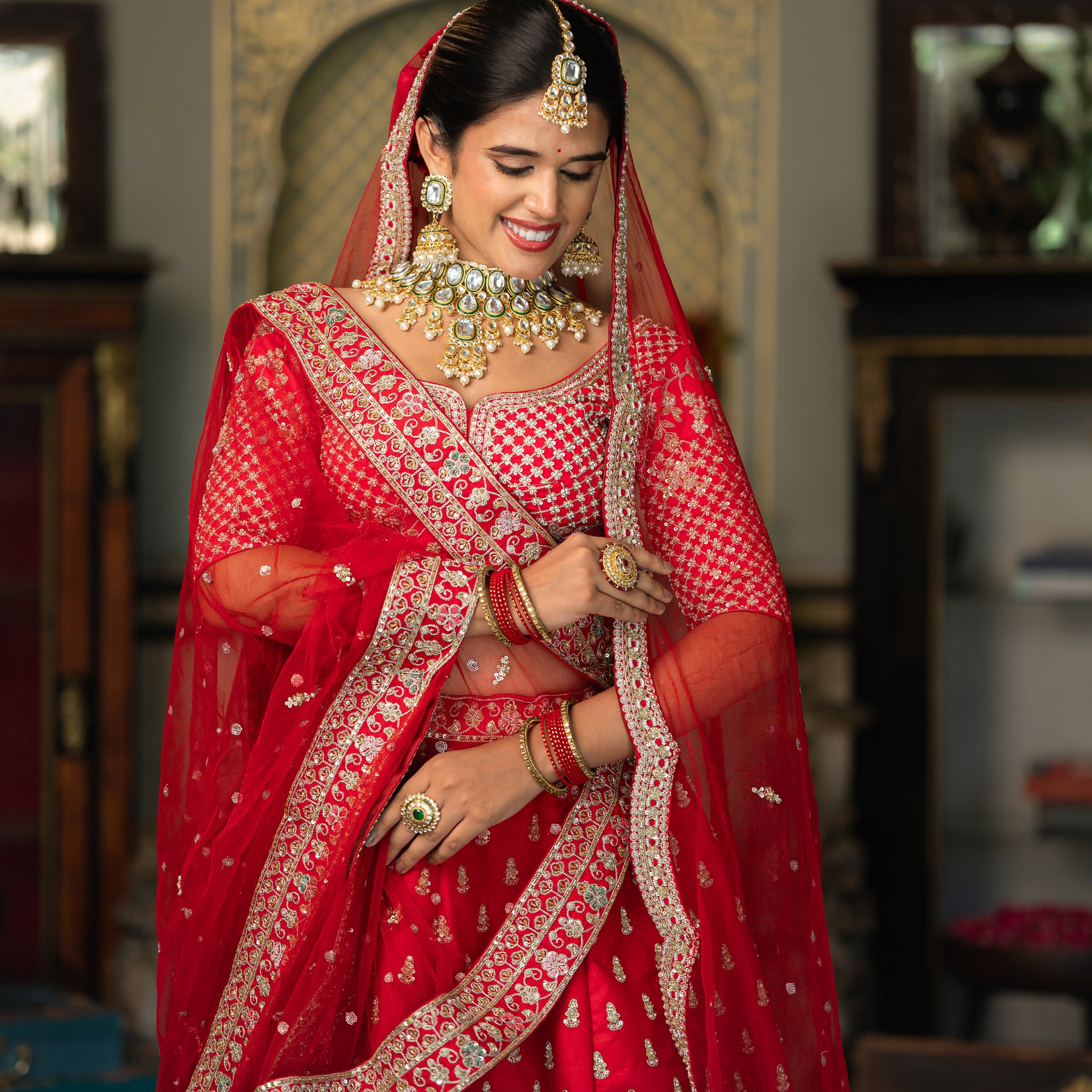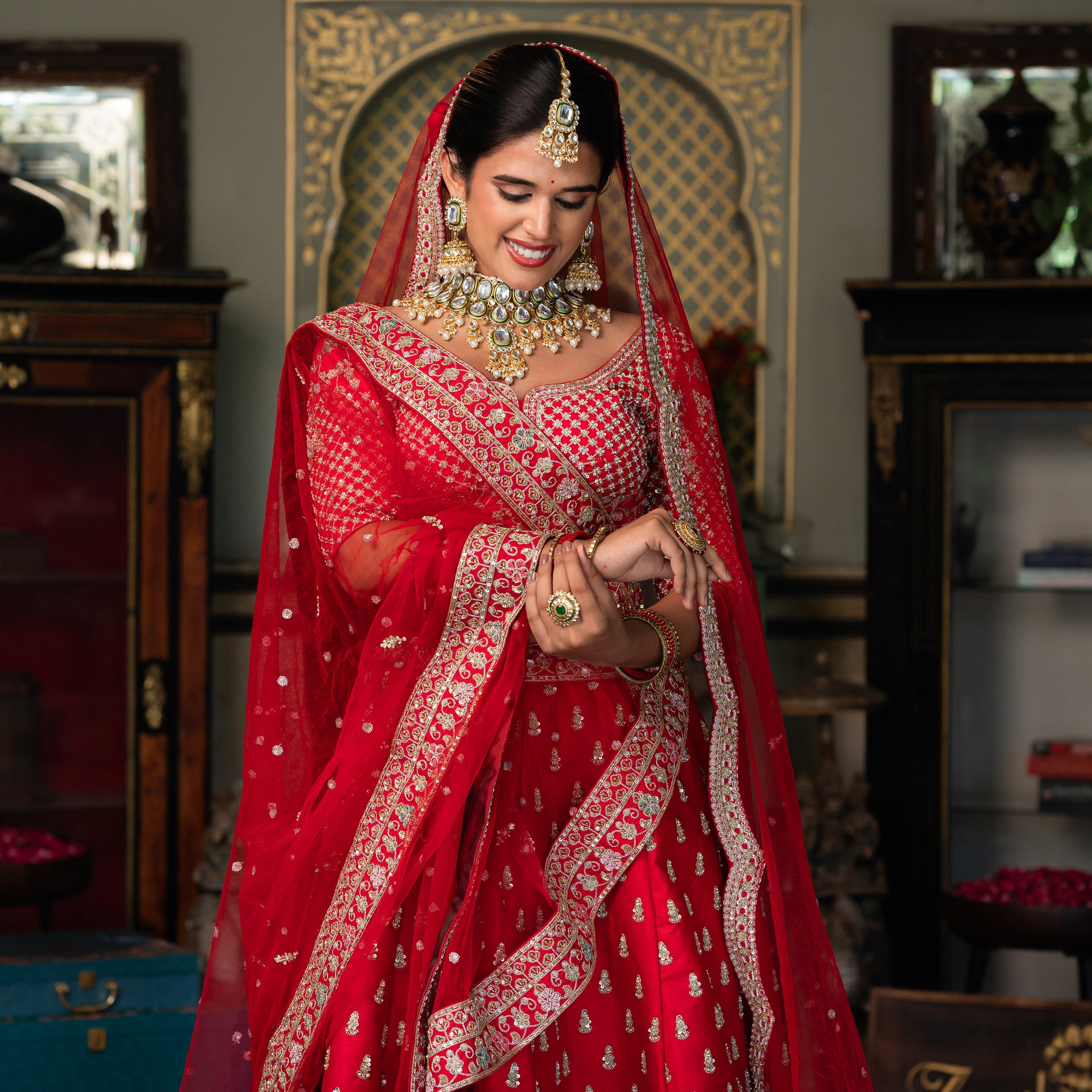 Crafted from luxurious raw silk, the lehenga offers a beautiful texture and an elegant drape. The bright cheery red hue is a classic bridal choice, beautifully complemented by meticulous Aari, sequins, and moti work. The intricate embroidery adds a brilliant shimmer and a touch of traditional artistry, ensuring you look and feel like royalty. This stunning bridal lehenga is a celebration of craftsmanship, designed to make you shine on your most special day.