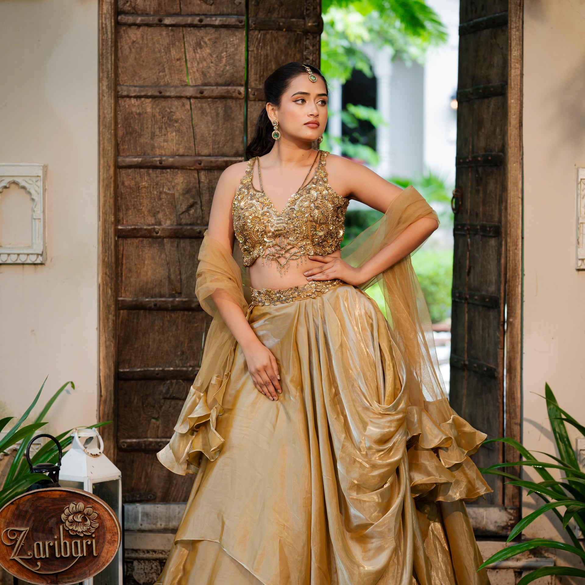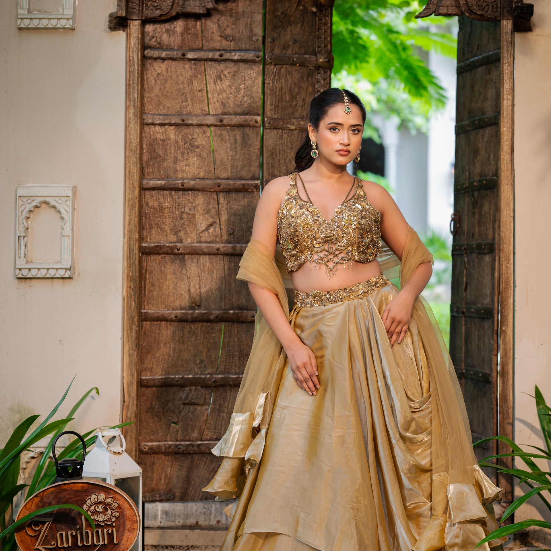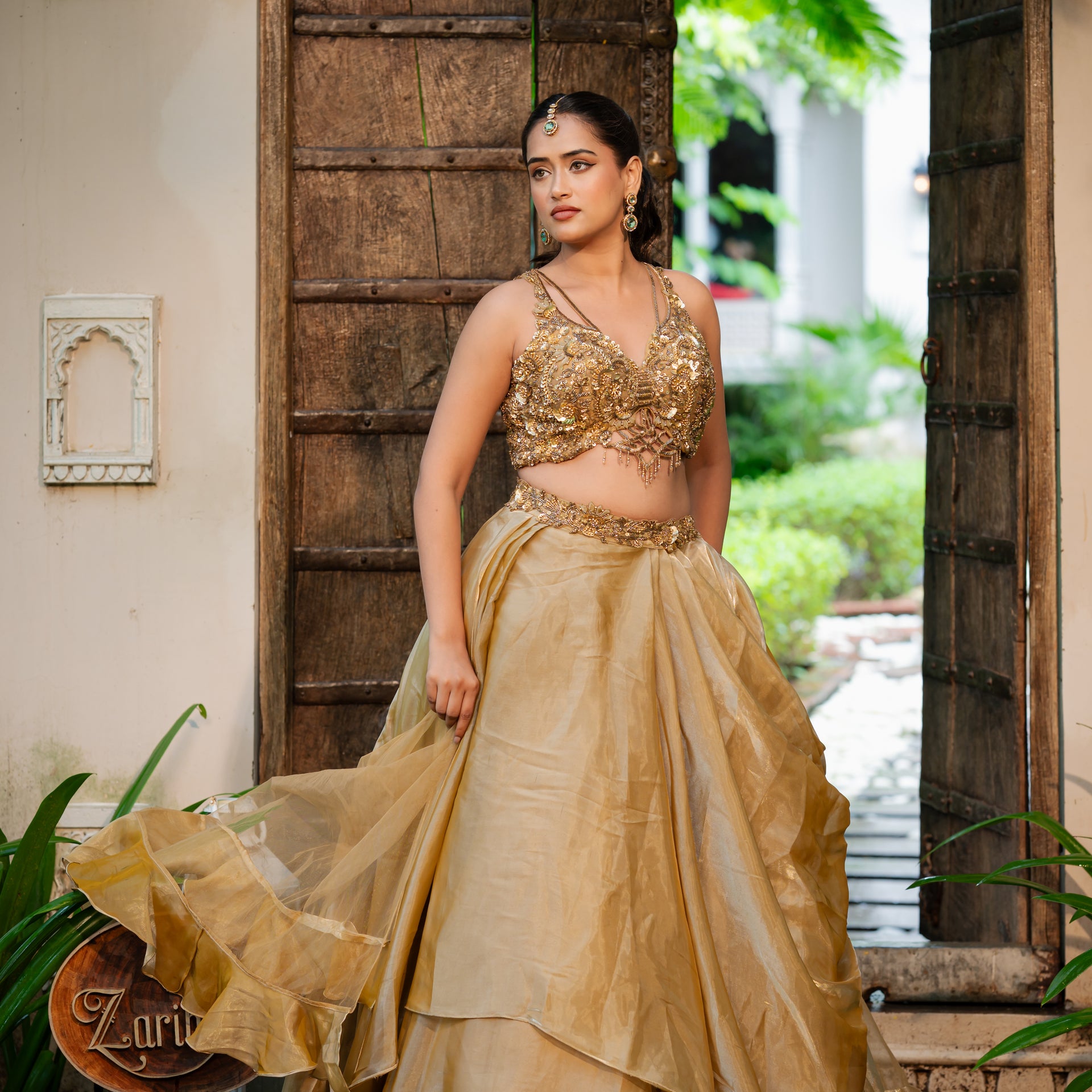 Crafted from luxurious tissue satin, the lehenga drapes beautifully, offering a sophisticated sheen. The rich coffee golden hue is a unique and regal alternative to classic tones. The entire ensemble is adorned with intricate Zardozi and sequins work, meticulously handcrafted to create a breathtaking design. The heavy blouse is a work of art in itself, complementing the lehenga perfectly and ensuring you make a memorable and stylish entrance.