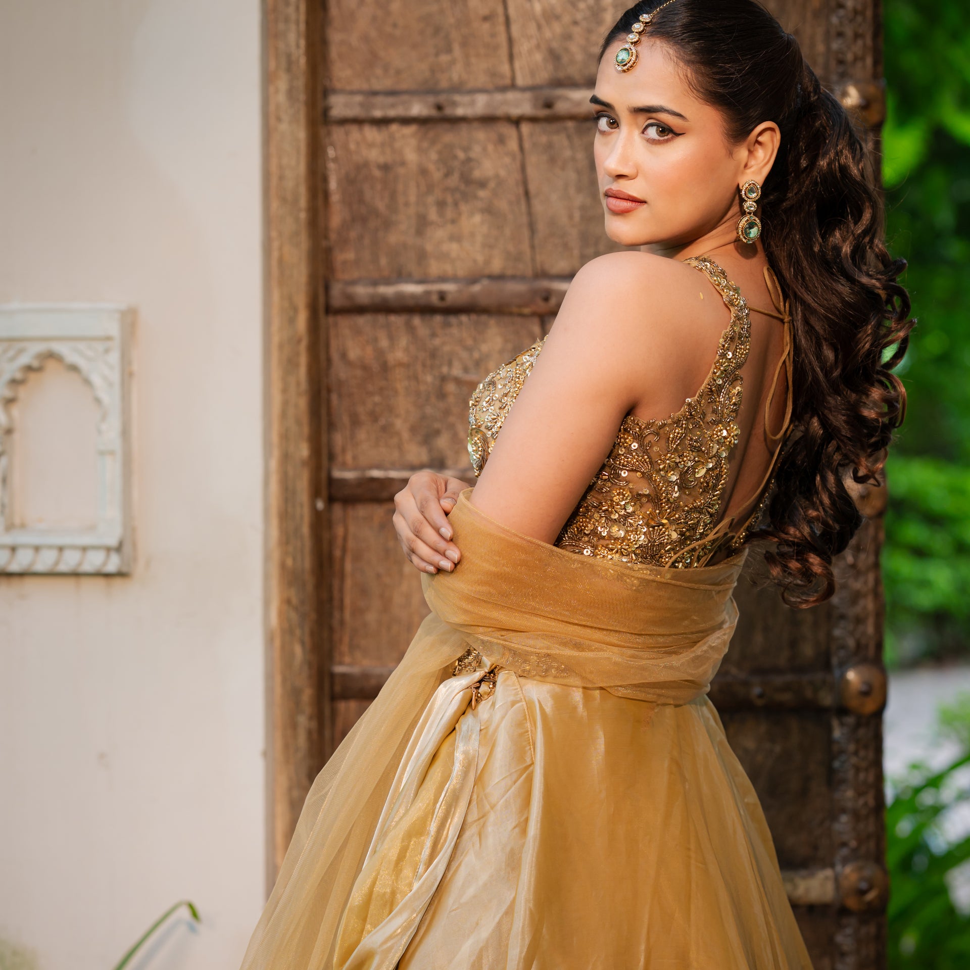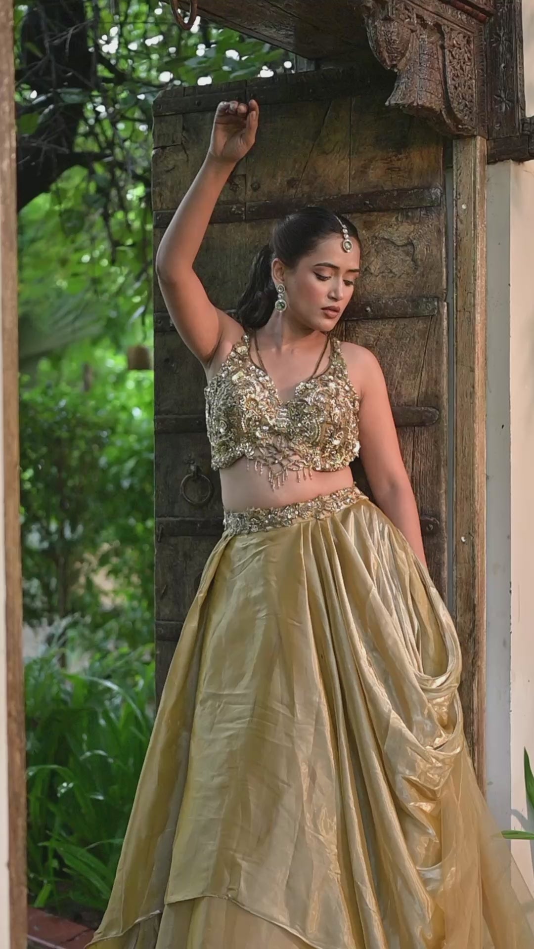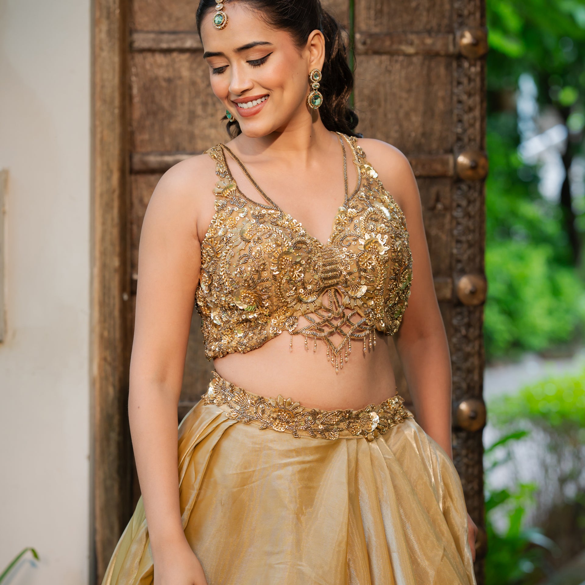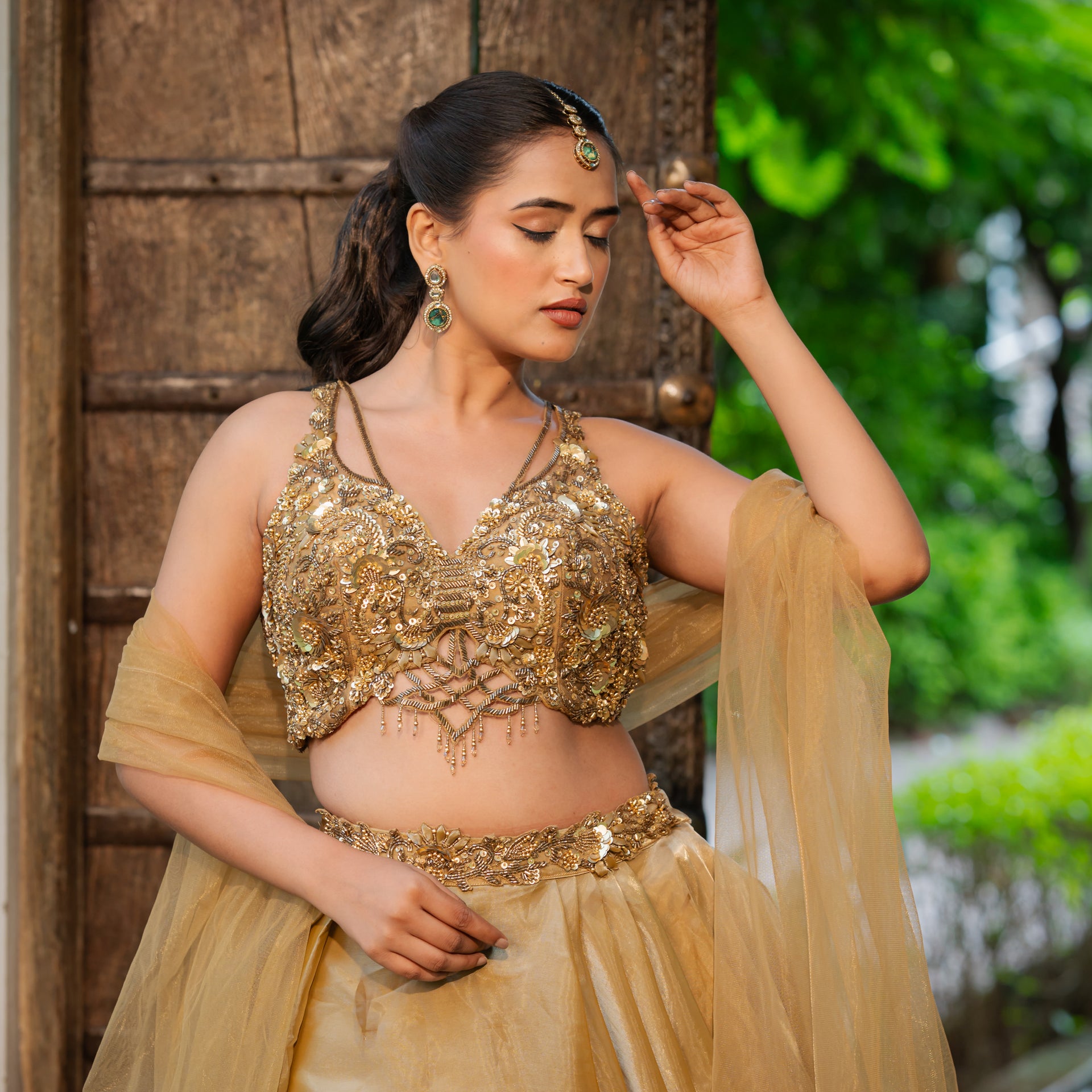 Crafted from luxurious tissue satin, the lehenga drapes beautifully, offering a sophisticated sheen. The rich coffee golden hue is a unique and regal alternative to classic tones. The entire ensemble is adorned with intricate Zardozi and sequins work, meticulously handcrafted to create a breathtaking design. The heavy blouse is a work of art in itself, complementing the lehenga perfectly and ensuring you make a memorable and stylish entrance.