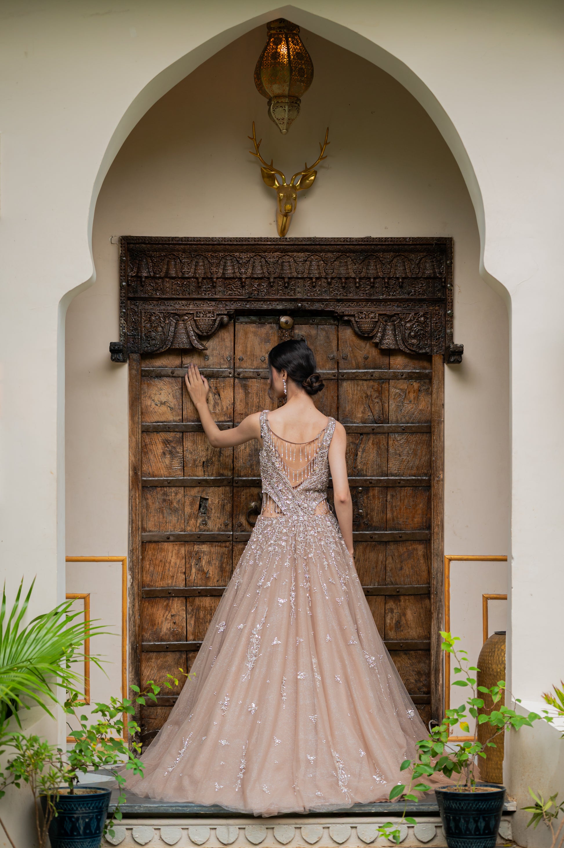 Make a striking entrance at your next event with our Dark Grayish Orange Soft Net Indo-Western. This designer piece is a perfect blend of Indian traditional wear and modern style, making it ideal for reception parties, cocktail events, and festive occasions. The outfit features exquisite hand-embroidered Kardana and sequins work that shimmers beautifully, adding a touch of glamour to your look.