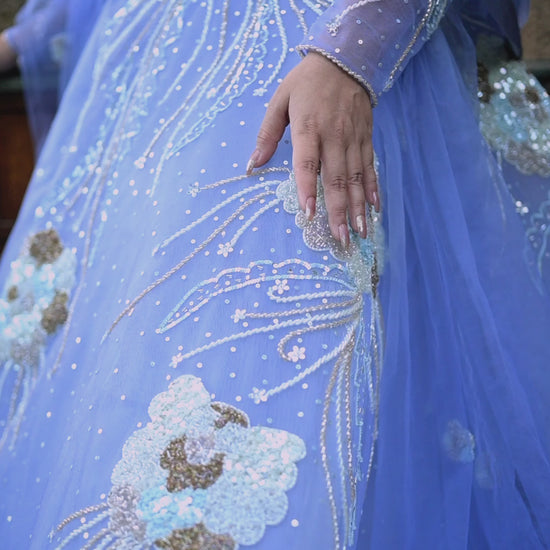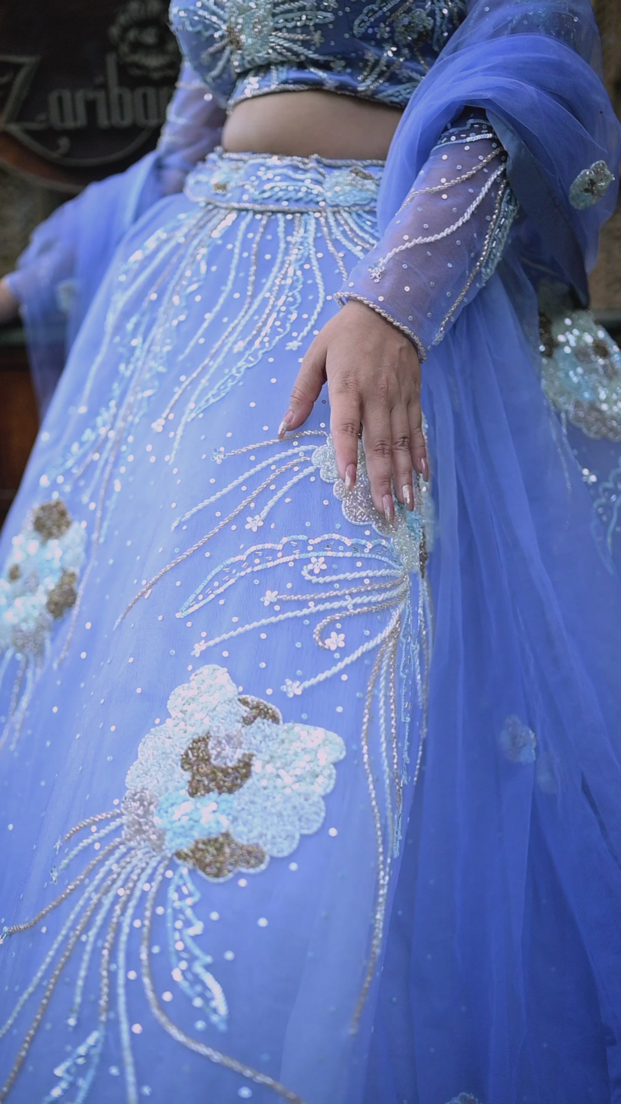 Crafted from premium soft net fabric, this lehenga offers a graceful drape and a delicate flow. The unique dark pastel blue hue is a subtle yet striking alternative to traditional colors, offering a fresh, contemporary look. The entire ensemble is beautifully adorned with intricate hand-done Kardana and sequins work, creating a dazzling effect that catches the light with every move. This lehenga set is a true work of art, designed to make you feel effortlessly graceful and radiant on your special day.