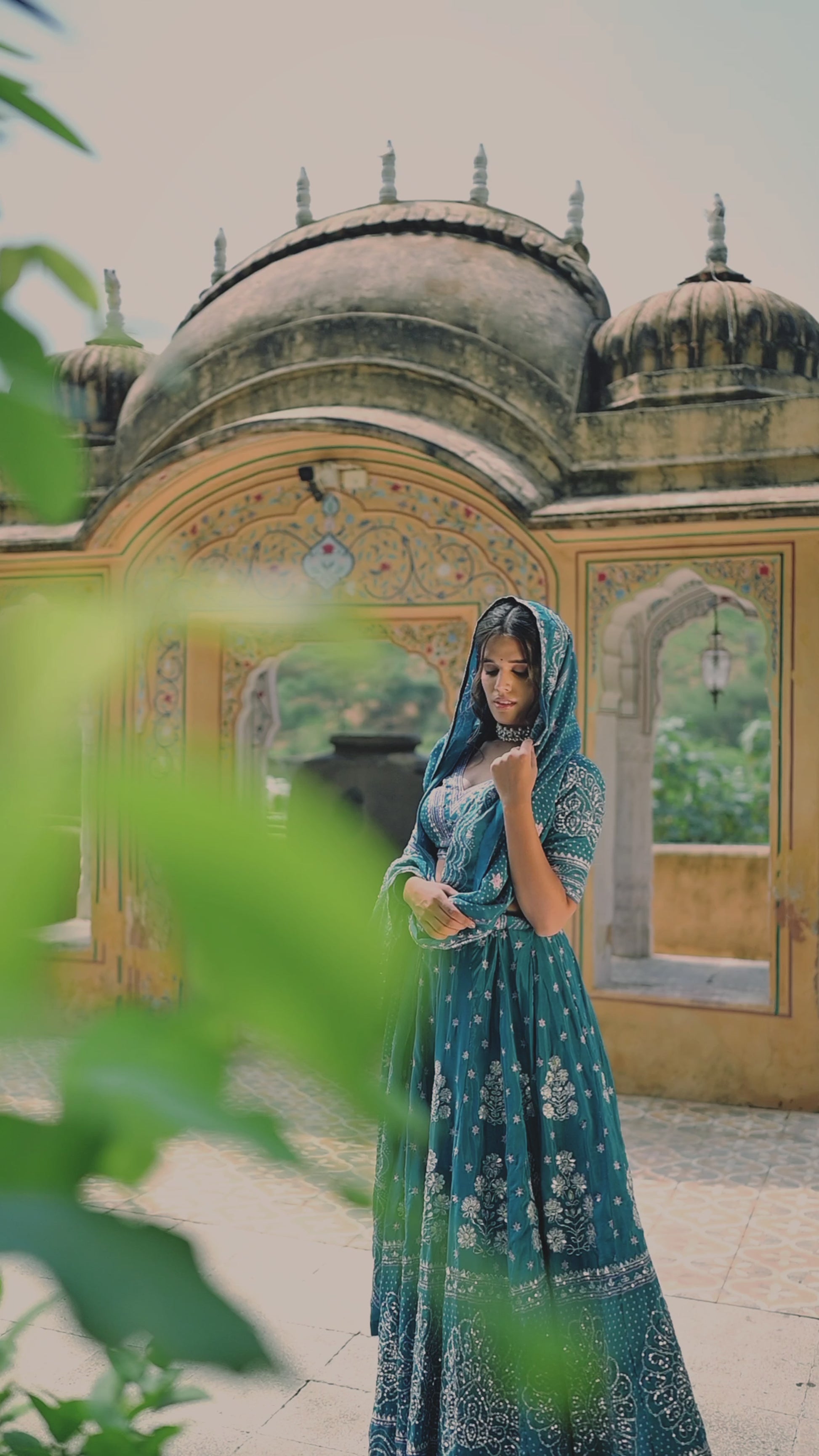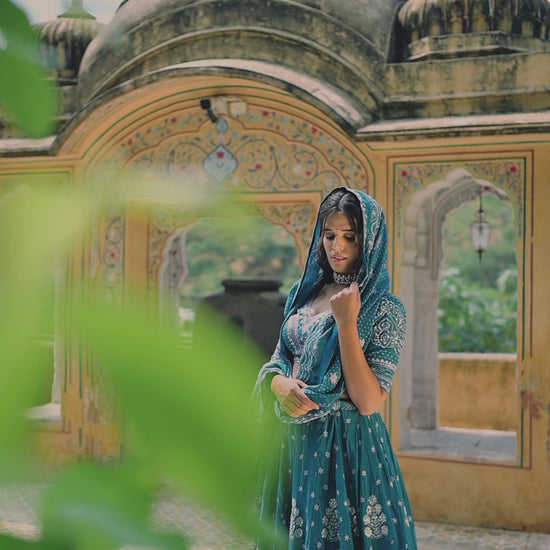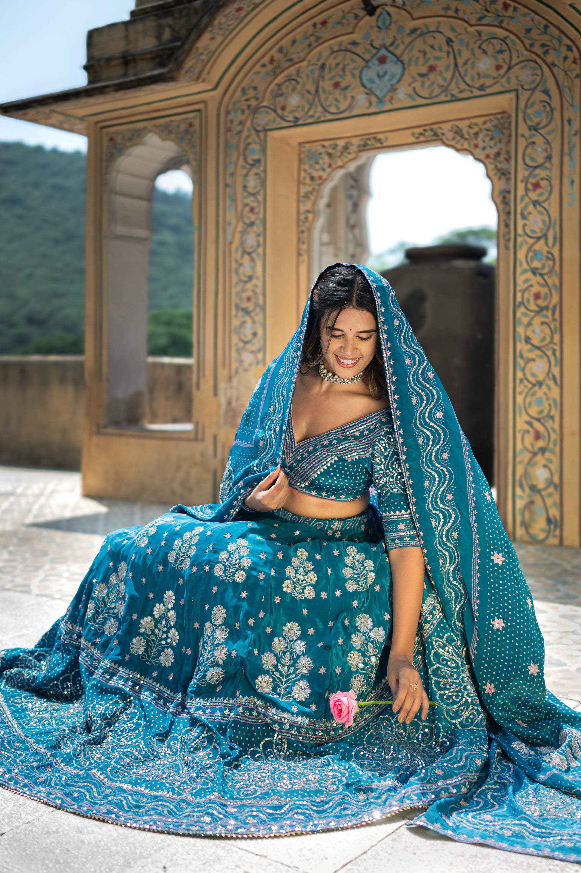 Step into a world of timeless tradition and artistic elegance with our stunning Eastern Blue Silk Bandhej Lehenga. This exquisite three-piece set, featuring a matching blouse and dupatta, is a celebration of rich heritage and meticulous craftsmanship. It’s the perfect choice for a grand entrance at a wedding, festive occasion, or special celebration.