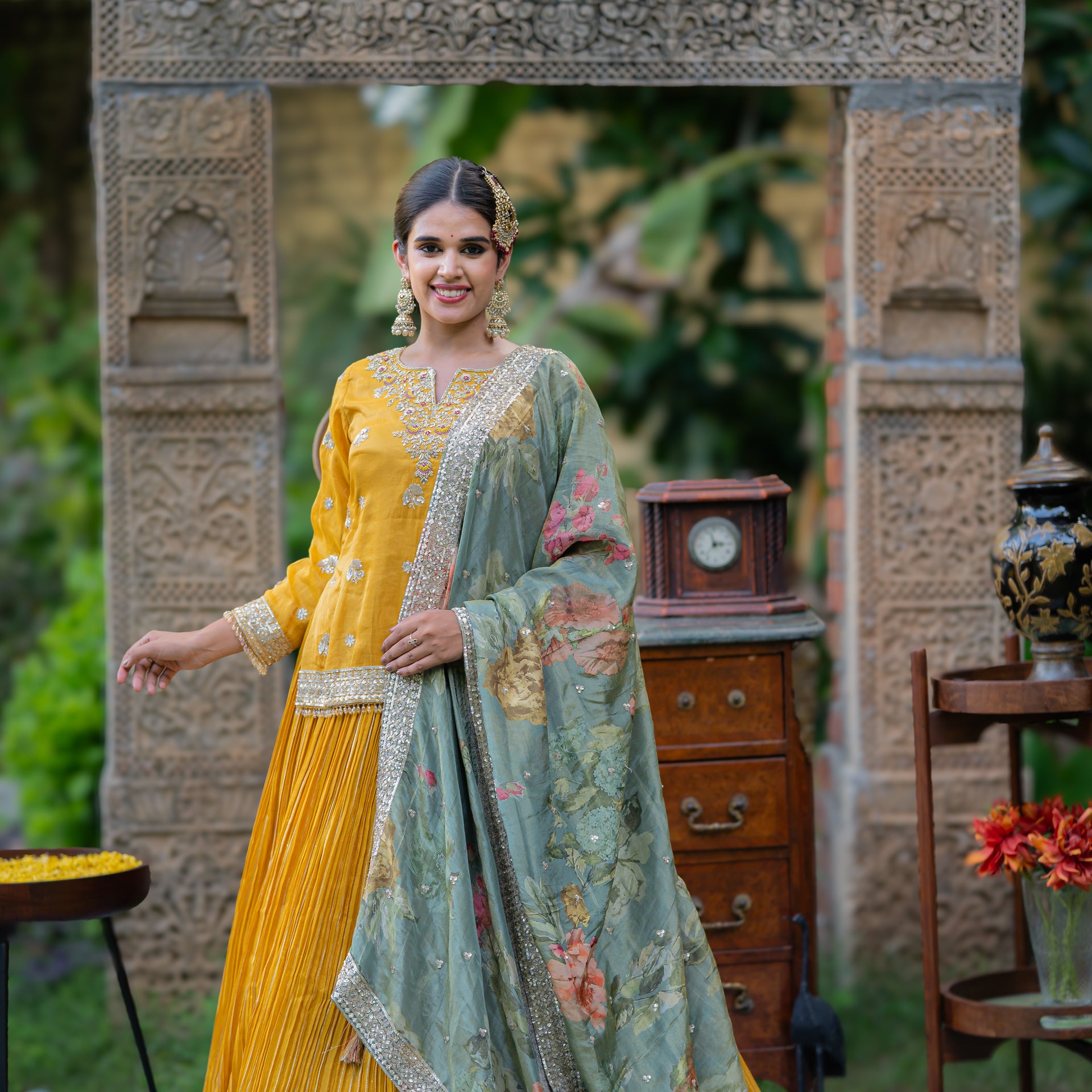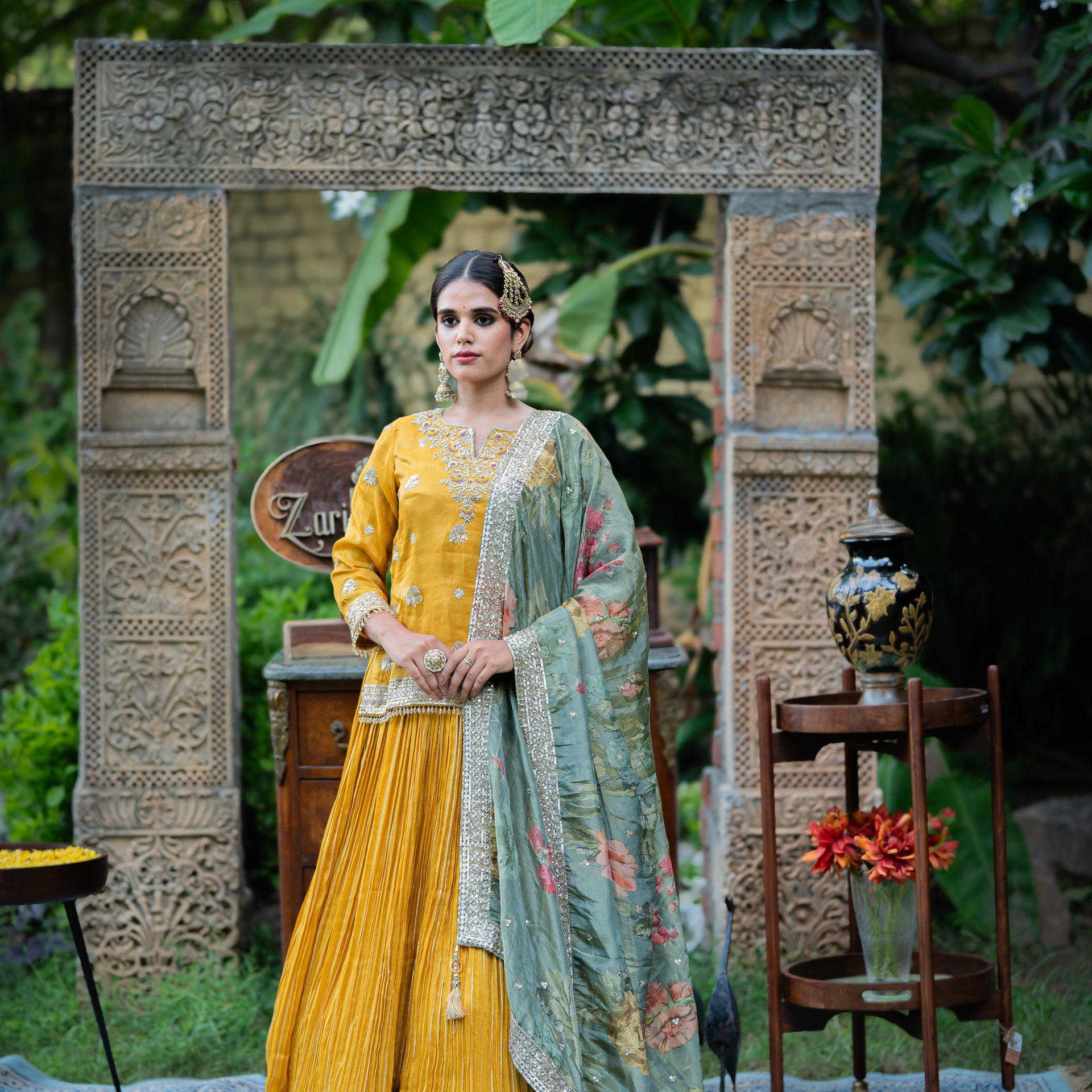 The luxurious tissue fabric offers a refined drape and a subtle sheen, while the vibrant mustard hue is a bold and celebratory choice. The entire ensemble is beautifully adorned with intricate hand-done Kardana and sequins work, creating a dazzling effect that catches the light with every move. This elegant set is a true work of art, designed to make you feel effortlessly graceful and radiant on your special day.