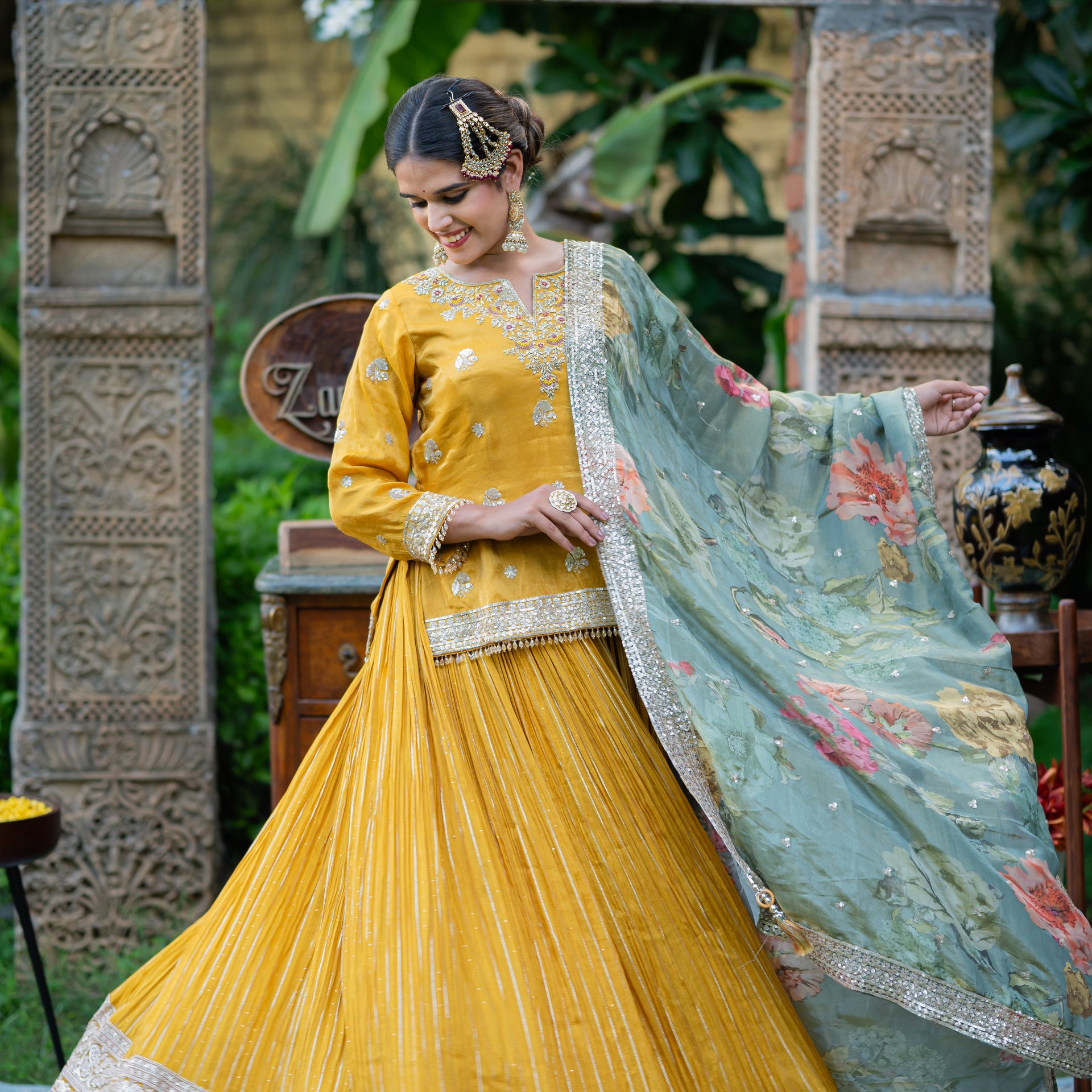 Make a statement in our stunning Mustard Tissue Lehenga, a perfect blend of modern elegance and traditional charm. This complete three-piece set, featuring a stylish short kurta and a matching dupatta, is a captivating choice for weddings, receptions, and festive celebrations.
