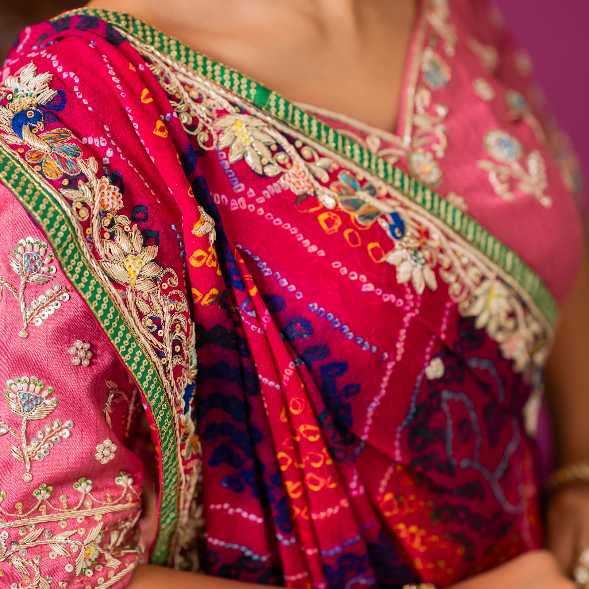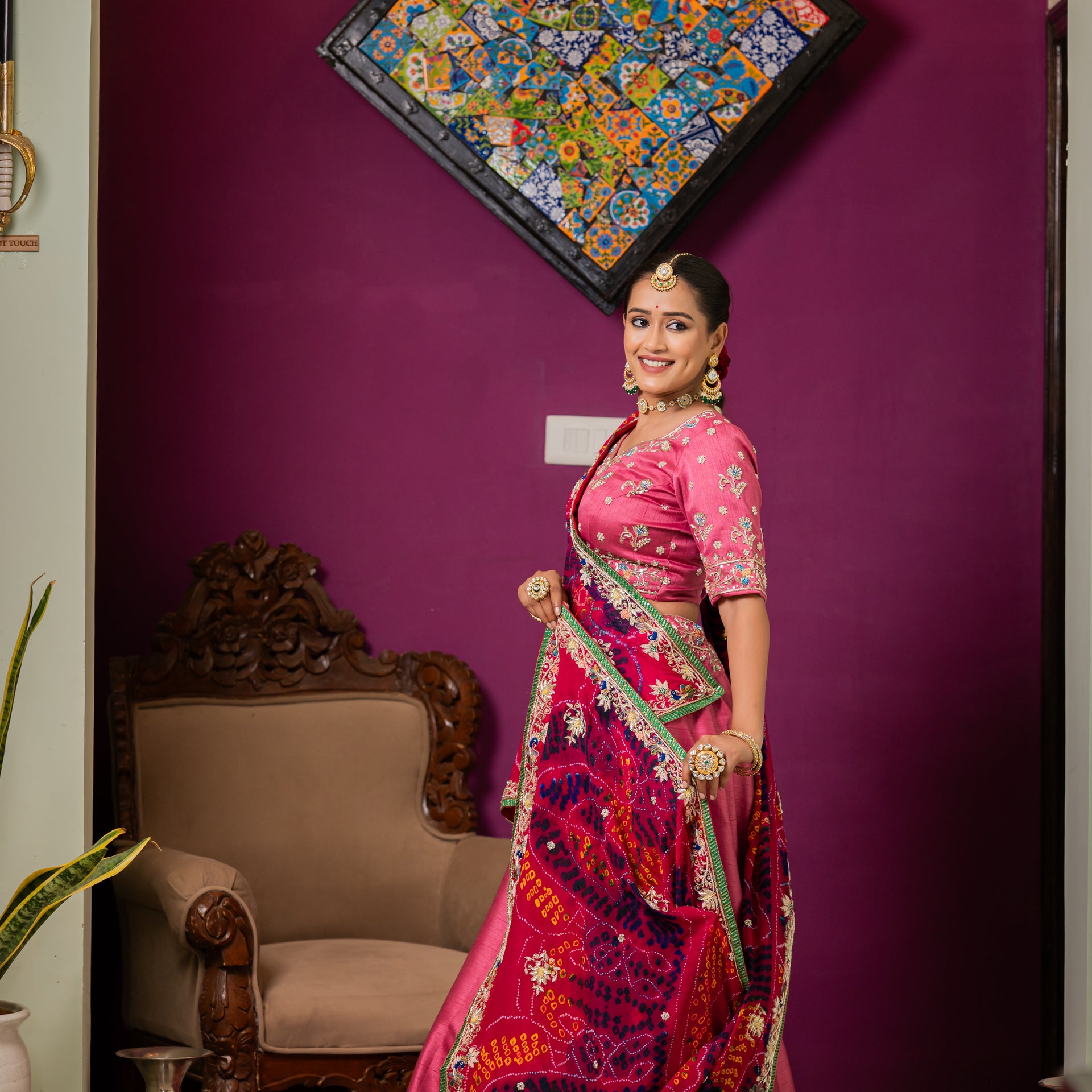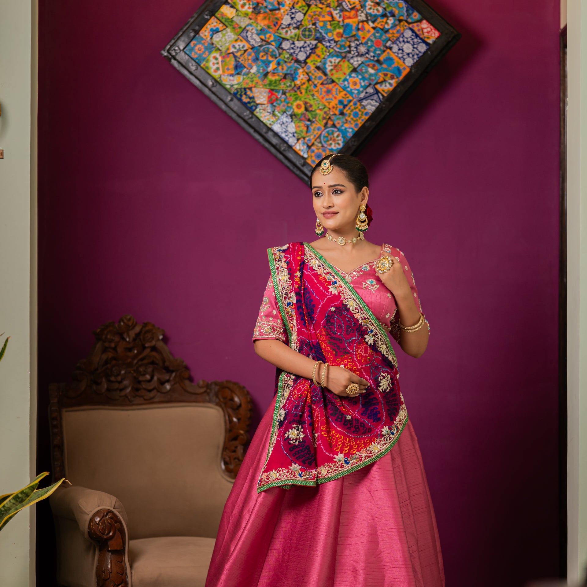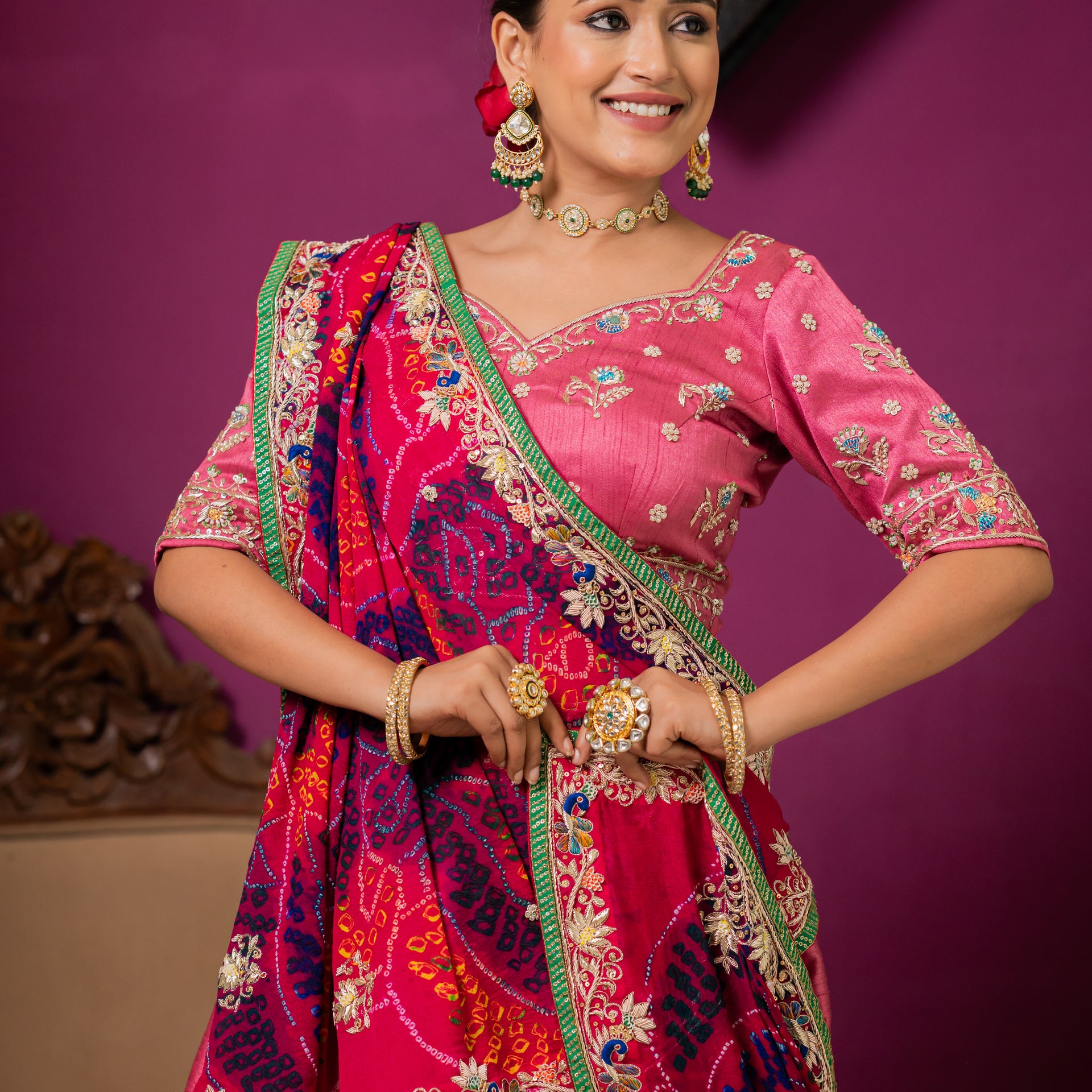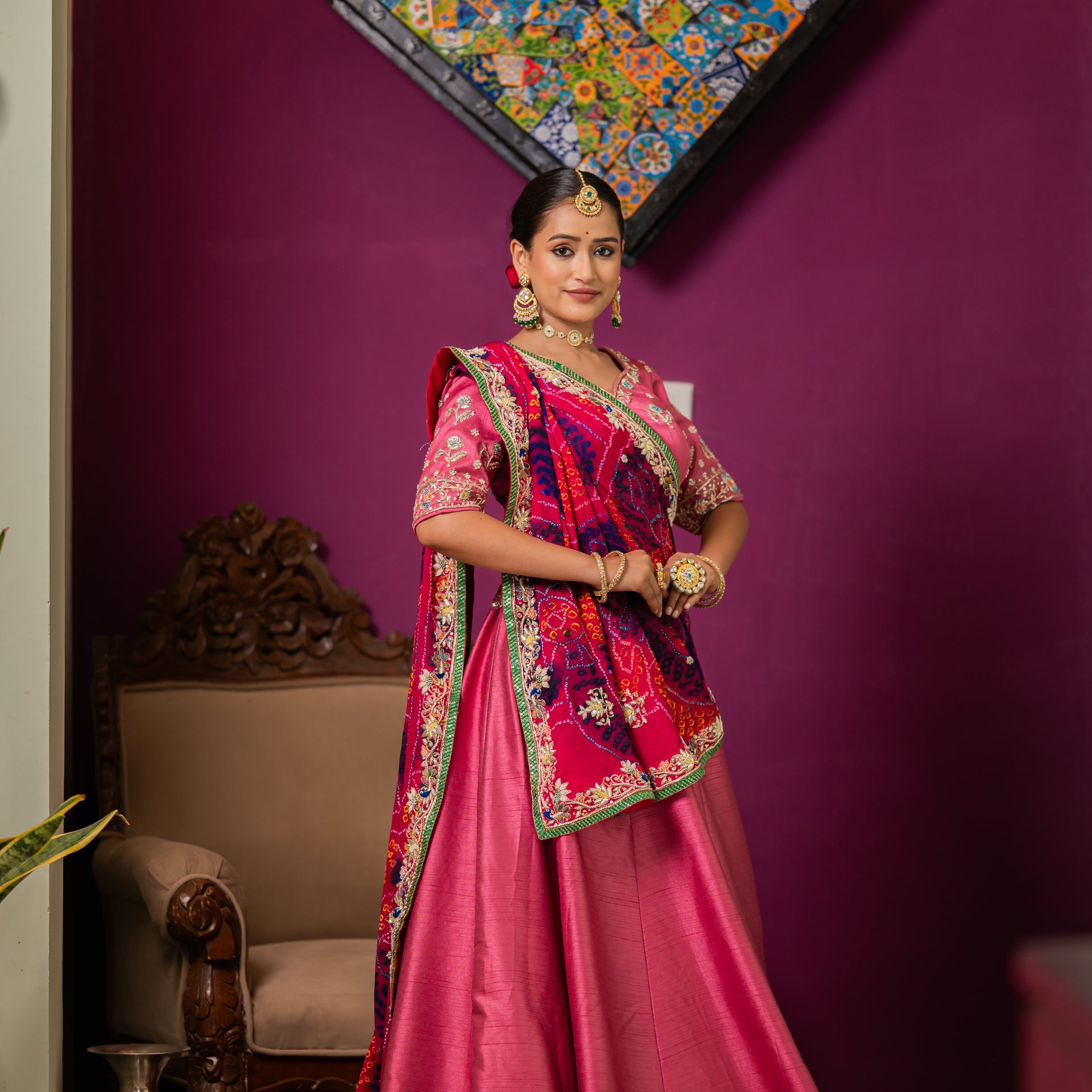 Drape yourself in the artistic elegance of our Pink Pure Ojariya Bandhej Chunari. This exquisite piece is a celebration of vibrant color and intricate traditional craftsmanship, perfect for adding a touch of elegance to any festive or wedding look.