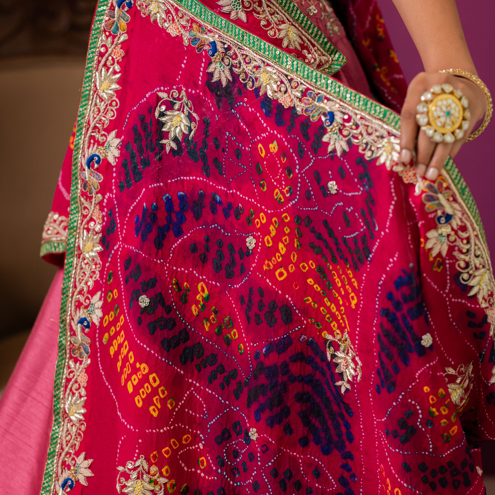 The beautiful Bandhej (or Bandhani) chunari is crafted from pure Ojariya silk, offering a refined drape and a subtle sheen. The rich pink hue is perfectly complemented by intricate hand-done Zardozi, thread, and sequins work. The detailed small peacock motifs add a touch of artistic charm, while the luxurious handwork creates a brilliant and opulent design. This chunari is a true work of art, a perfect accessory for any grand celebration.