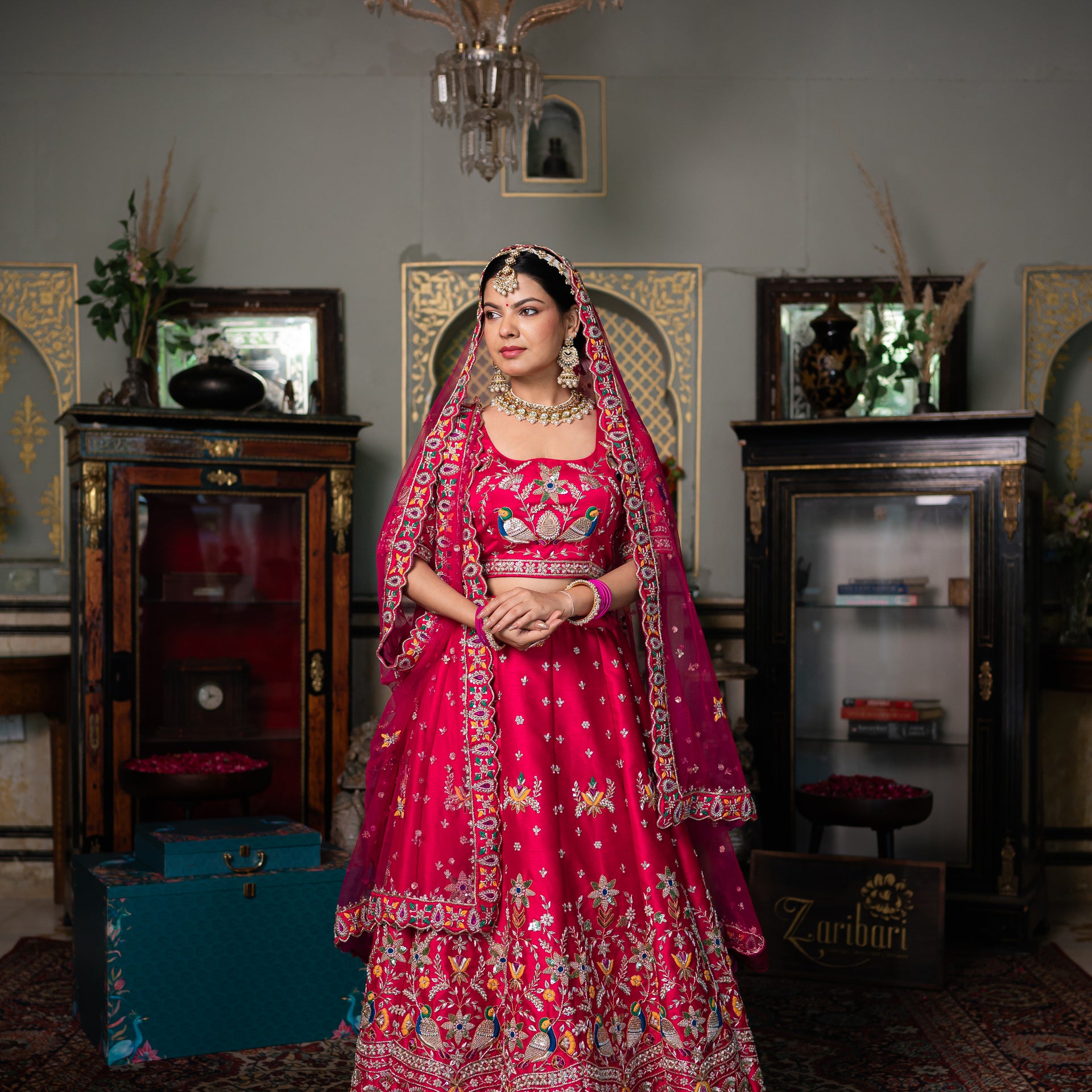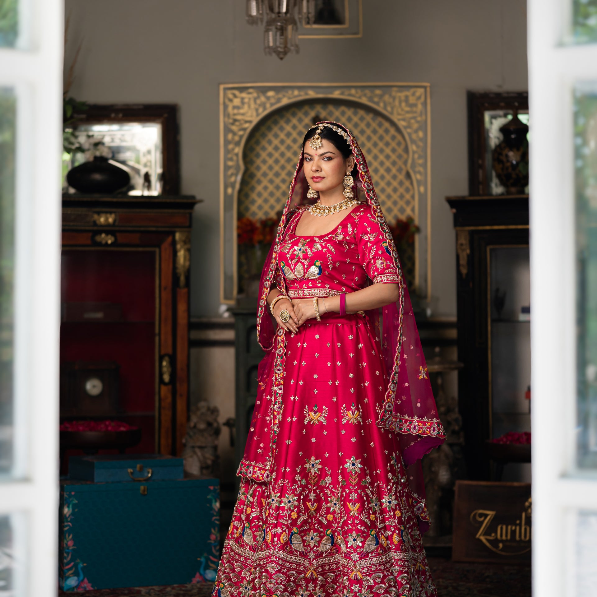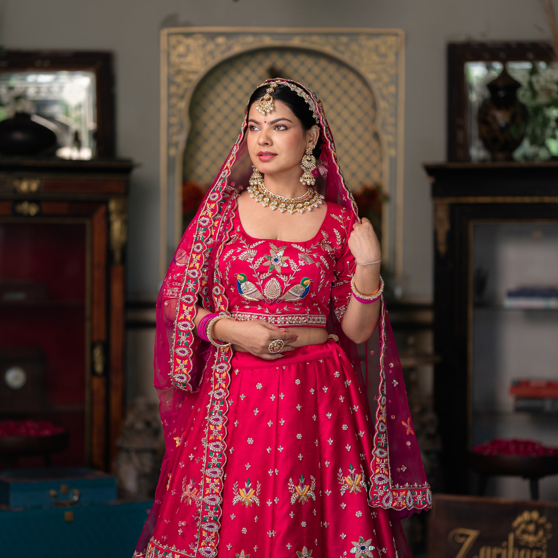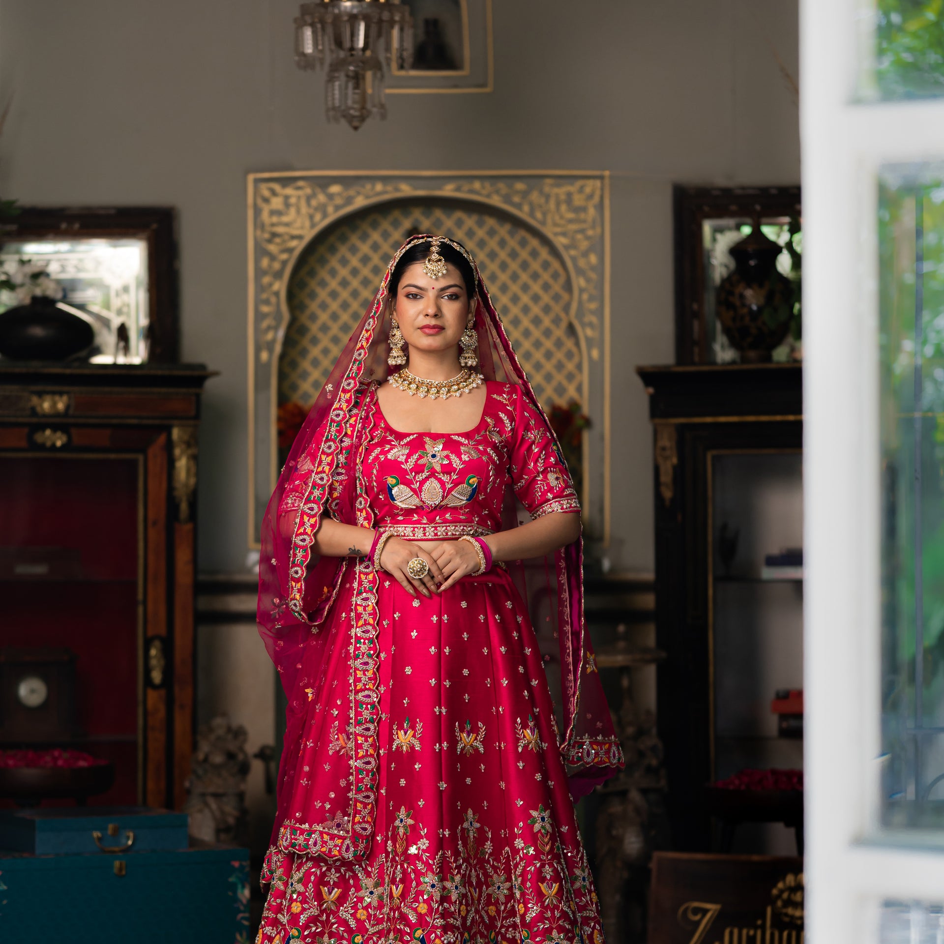 Crafted from luxurious raw silk, the lehenga offers a beautiful texture and an elegant drape. The stunning pink and red shade is beautifully complemented by meticulous hand-done Zardozi, sequins, and moti work. The detailed bird motifs add a touch of artistic charm, while the intricate embroidery and shimmering details ensure you look and feel like royalty. This stunning bridal lehenga is a celebration of craftsmanship, designed to make you shine on your most special day.