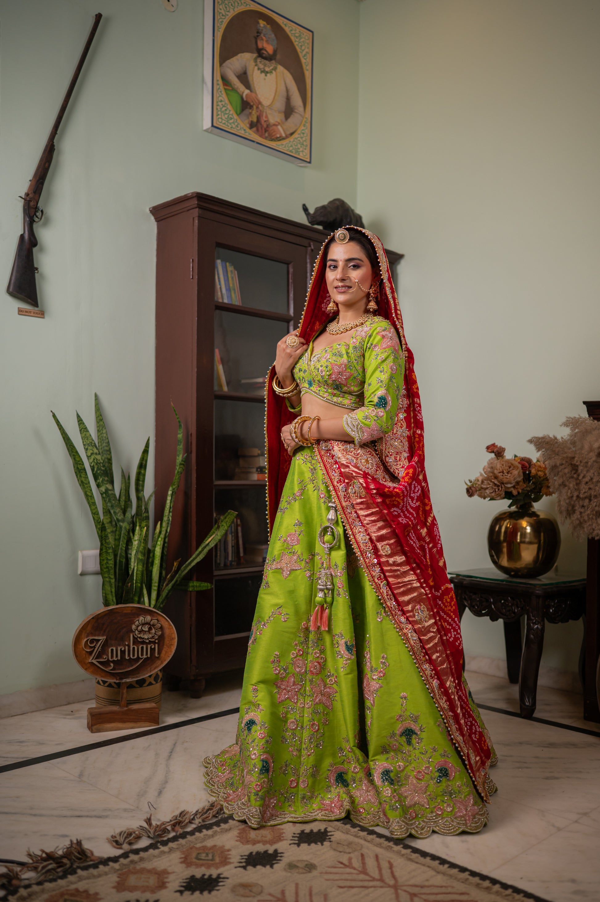 The beautiful Bandhej chunari is crafted from luxurious pure Gajji silk, offering a refined drape and a subtle sheen. The classic red hue is perfectly complemented by the elegant Ghatchola pattern and a breathtaking array of hand-done Marodi, Zardozi, and sequins work. The detailed bird motifs add a touch of artistic charm, while the luxurious handwork creates a brilliant and opulent design. This chunari is a true work of art, a perfect accessory for any grand celebration.