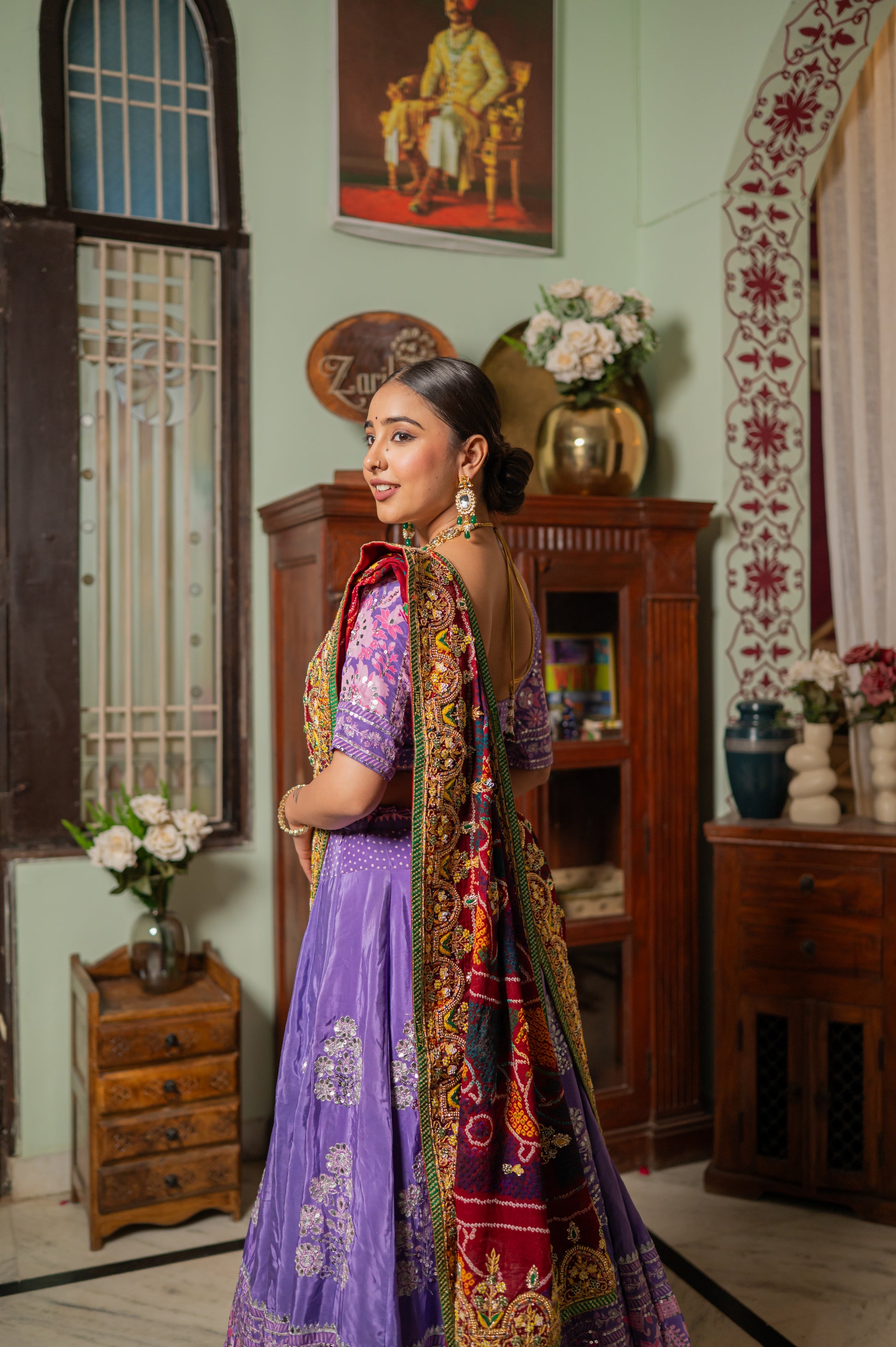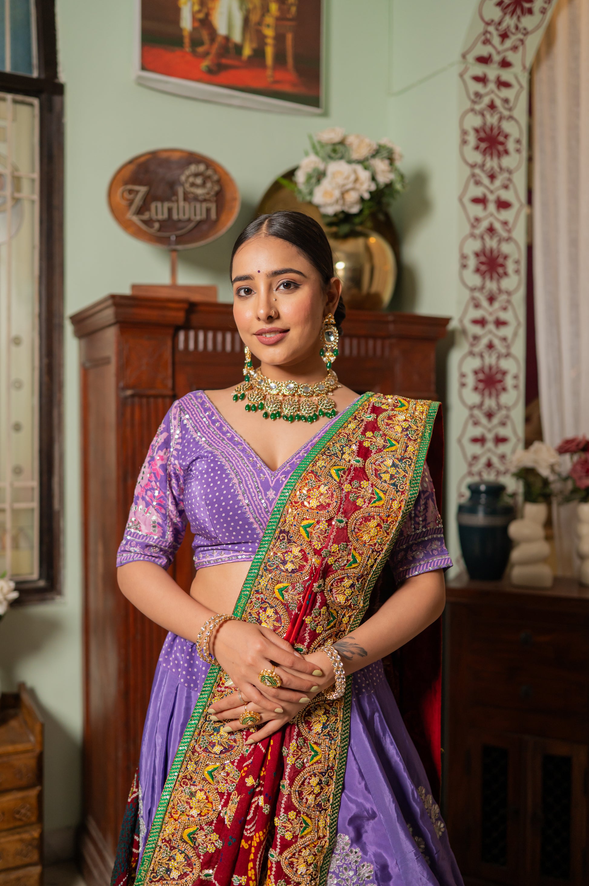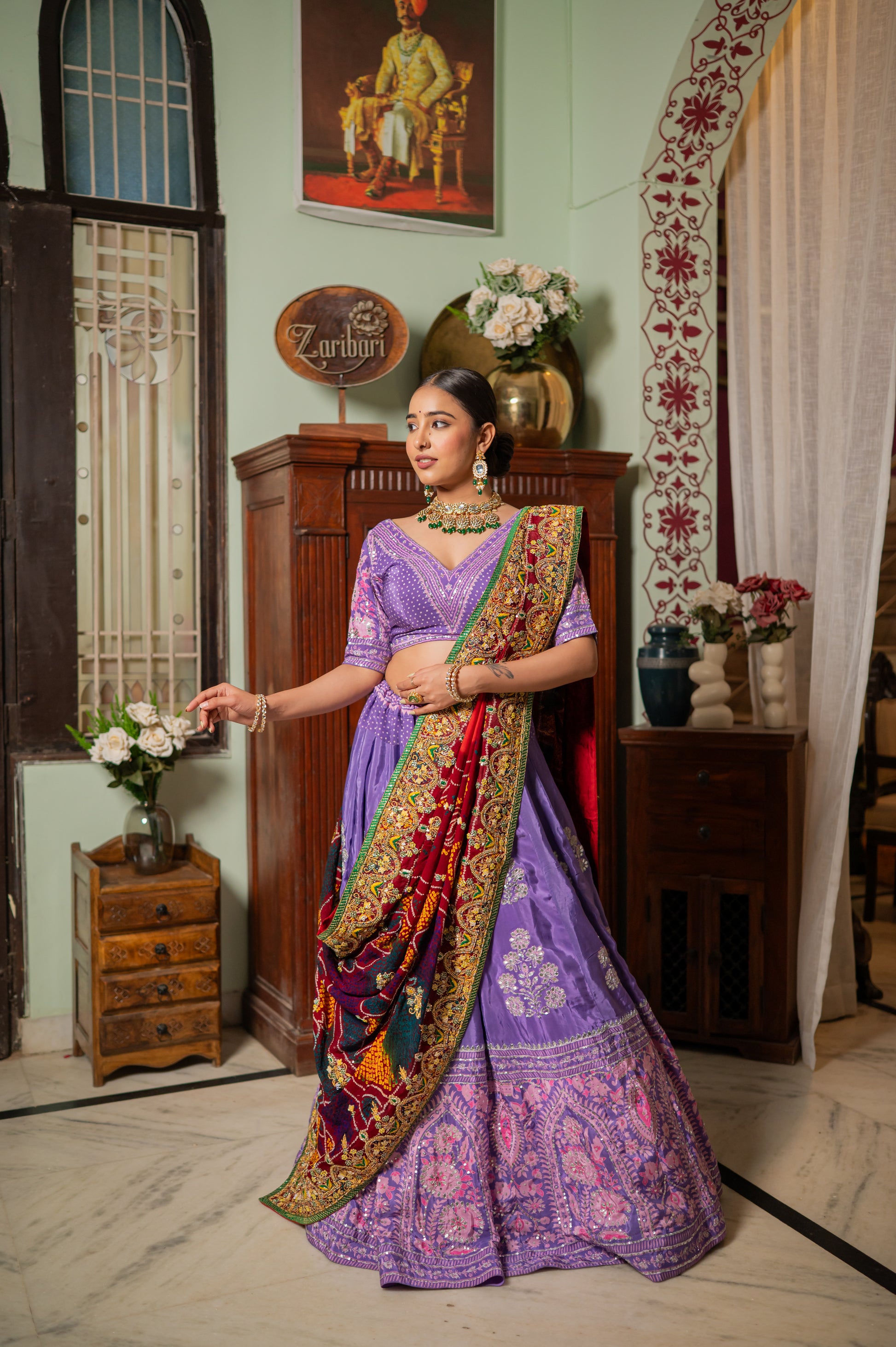 The beautiful Bandhej (or Bandhani) chunari is crafted from pure Ojariya silk, offering a refined drape and a subtle sheen. The rich red hue is perfectly complemented by intricate Gota Patti, thread, sequins, and beads work. The luxurious handwork creates a brilliant and opulent design, ensuring you make a graceful and memorable entrance. This chunari is a true work of art, perfect for adding a touch of traditional luxury to your outfit.