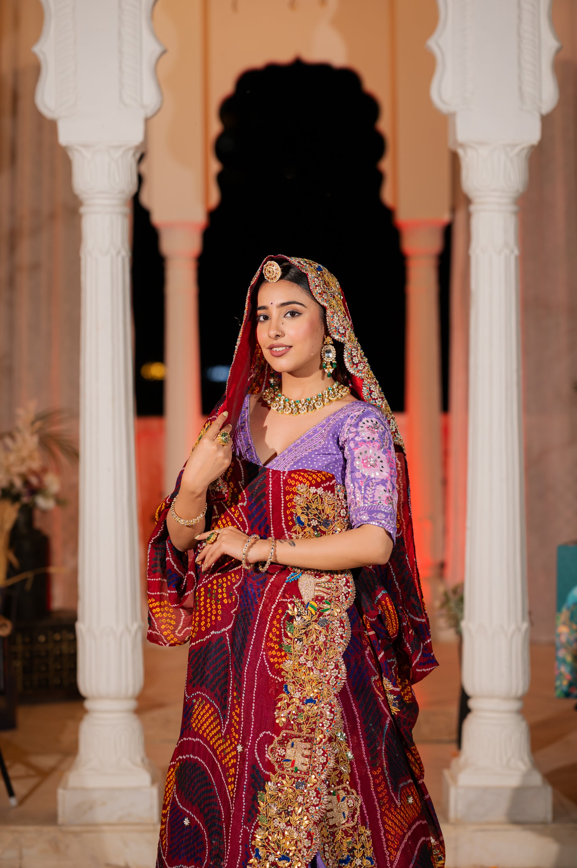 Drape yourself in the timeless elegance of our Red Pure Ojariya Bandhej Chunari. This exquisite piece is a celebration of vibrant color and meticulous craftsmanship, designed to elevate any festive or wedding look.