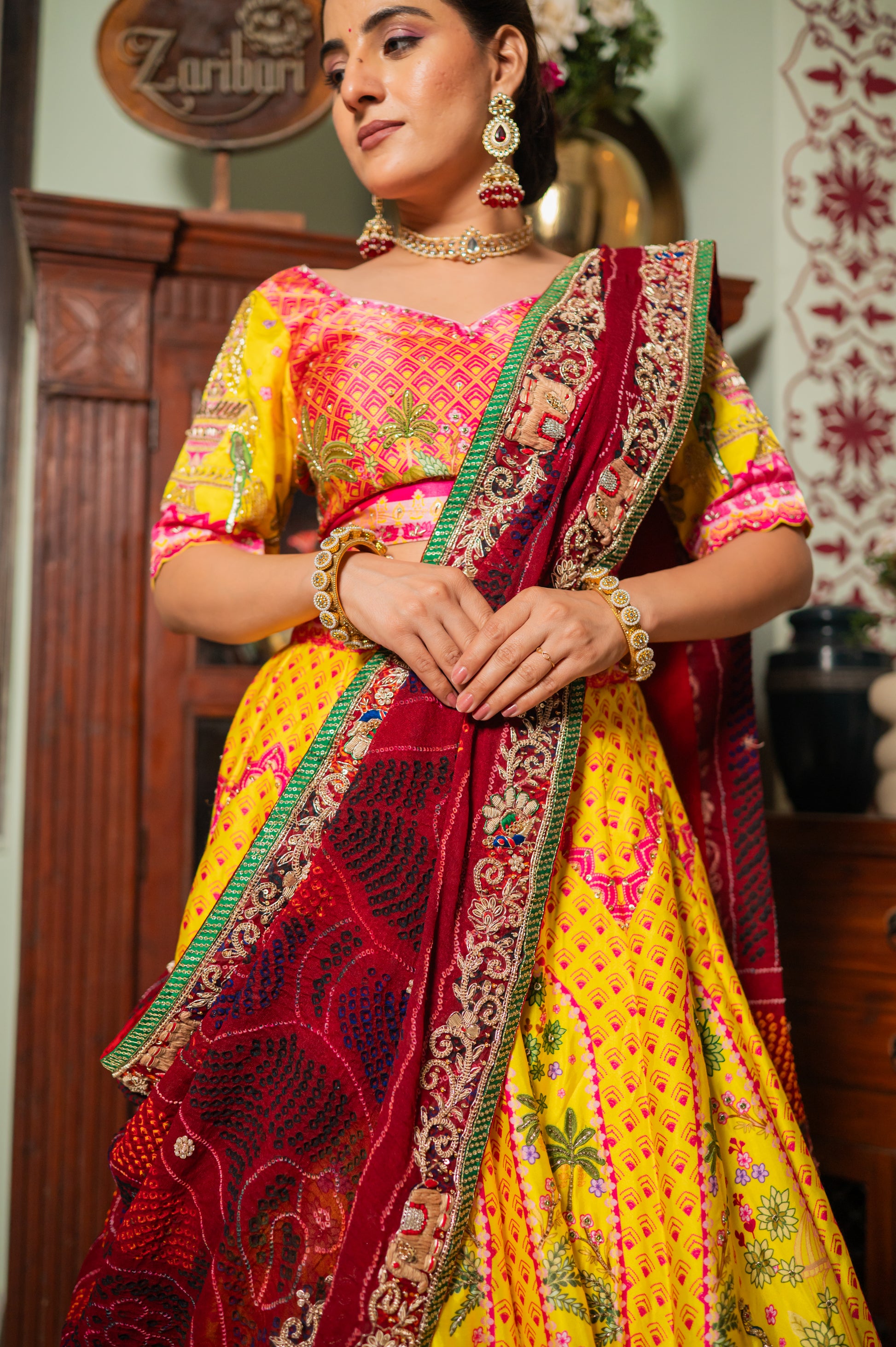 Drape yourself in the timeless elegance of our Red Pure Ojariya Bandhej Chunari. This exquisite piece is a celebration of vibrant color and meticulous craftsmanship, designed to elevate any festive or wedding look.