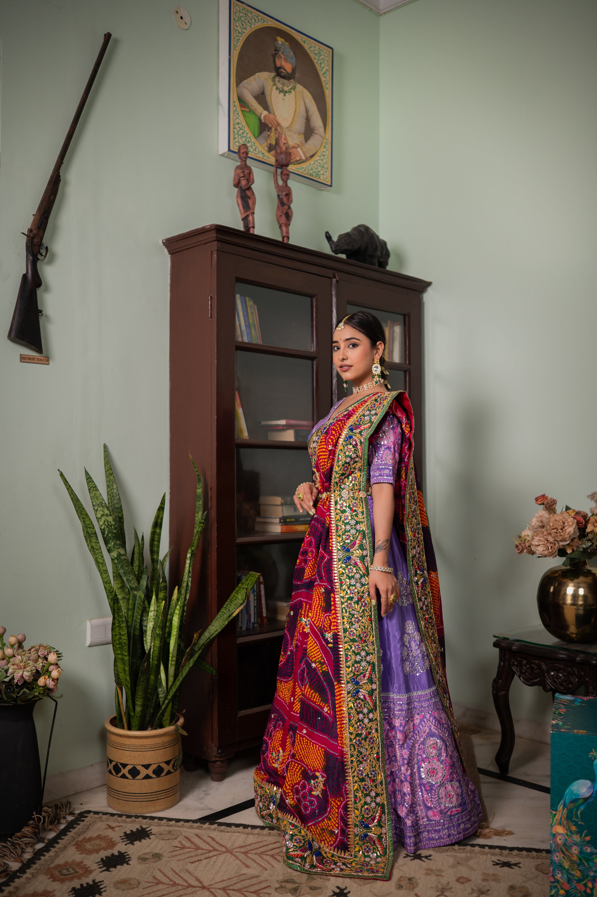 The beautiful Bandhej (or Bandhani) chunari is crafted from pure Ojariya silk, offering a refined drape and a subtle sheen. The rich red hue is perfectly complemented by intricate hand-done Zardozi, Gota Patti, and sequins work. The detailed double parrot motifs add a touch of artistic charm, while the luxurious handwork creates a brilliant and opulent design. This chunari is a true work of art, perfect for adding a touch of traditional luxury to your outfit.
