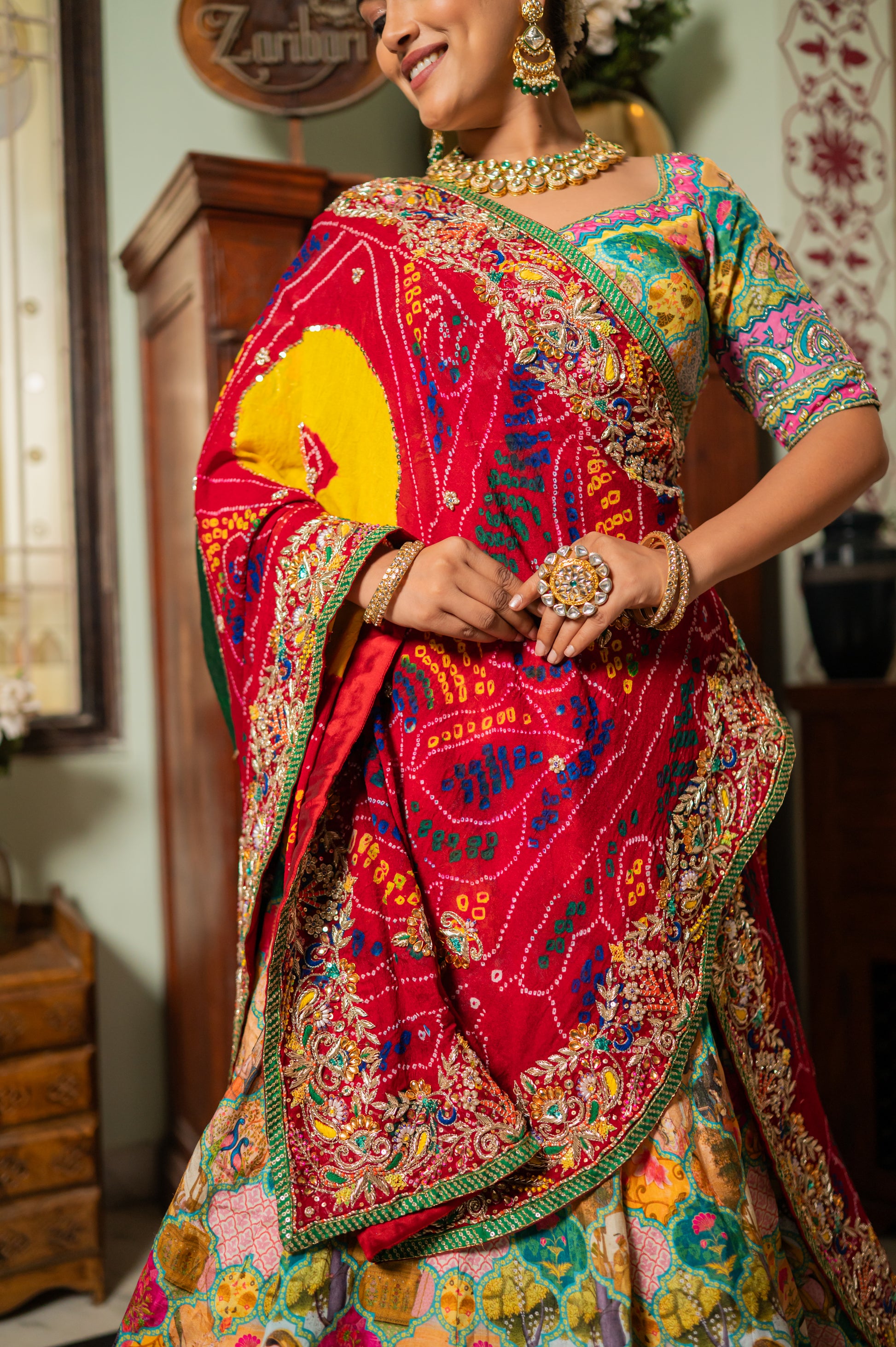 The beautiful Bandhej (or Bandhani) chunari is crafted from pure Ojariya silk, offering a refined drape and a subtle sheen. The rich red hue is perfectly complemented by intricate hand-done Zardozi, Marodi, thread, and beads work. The detailed handwork creates a brilliant and opulent design, ensuring you make a graceful and memorable entrance. This chunari is a true work of art, perfect for adding a touch of traditional luxury to your outfit.