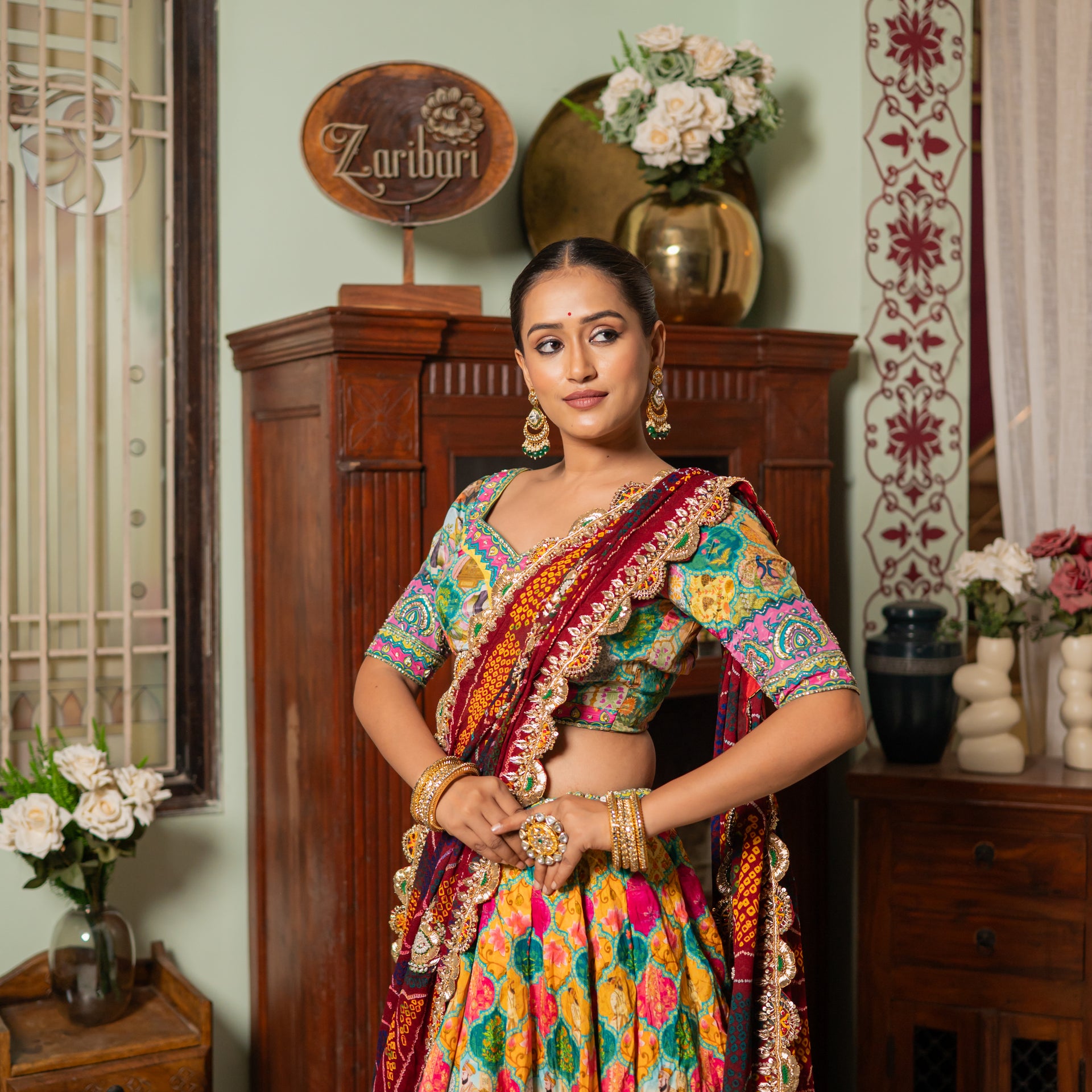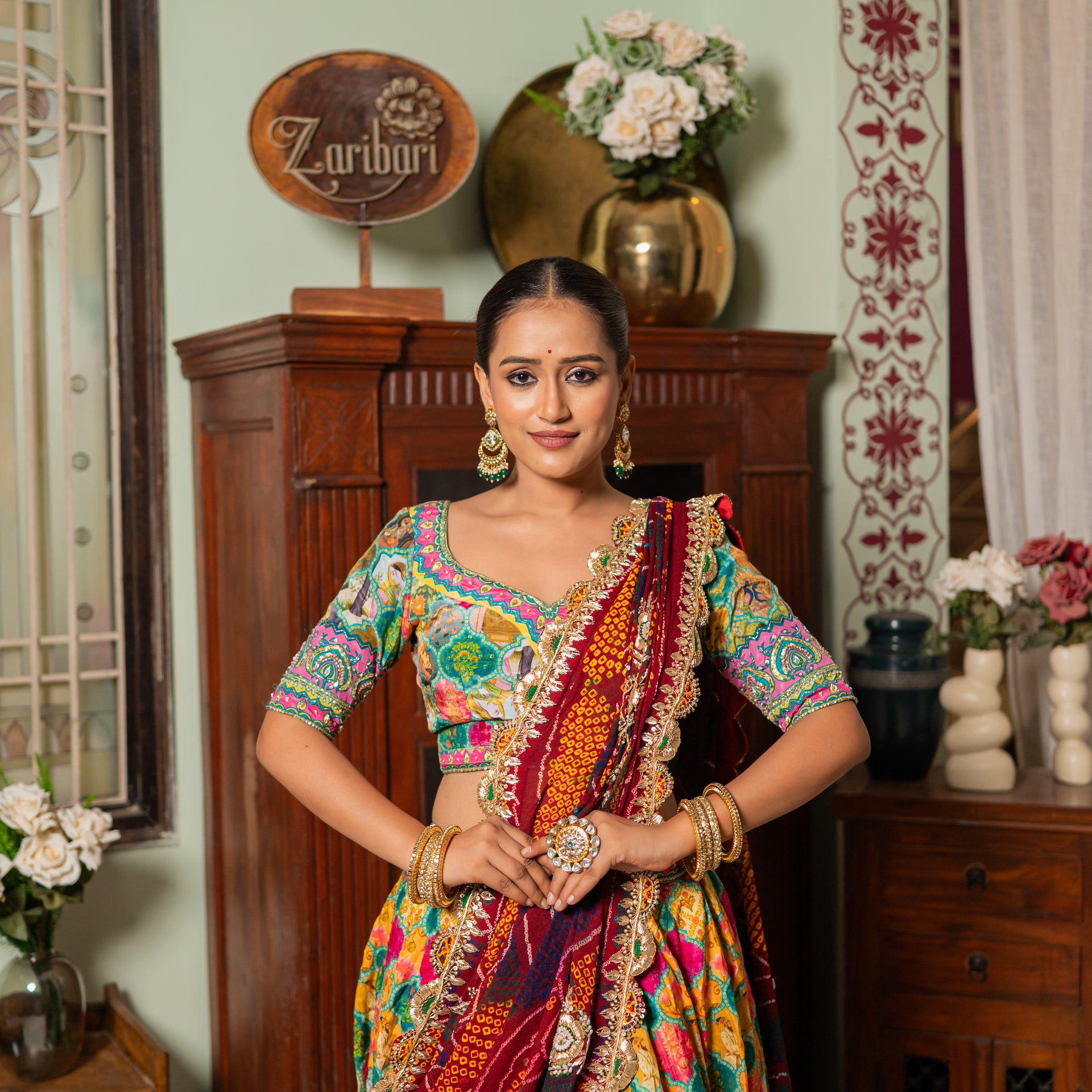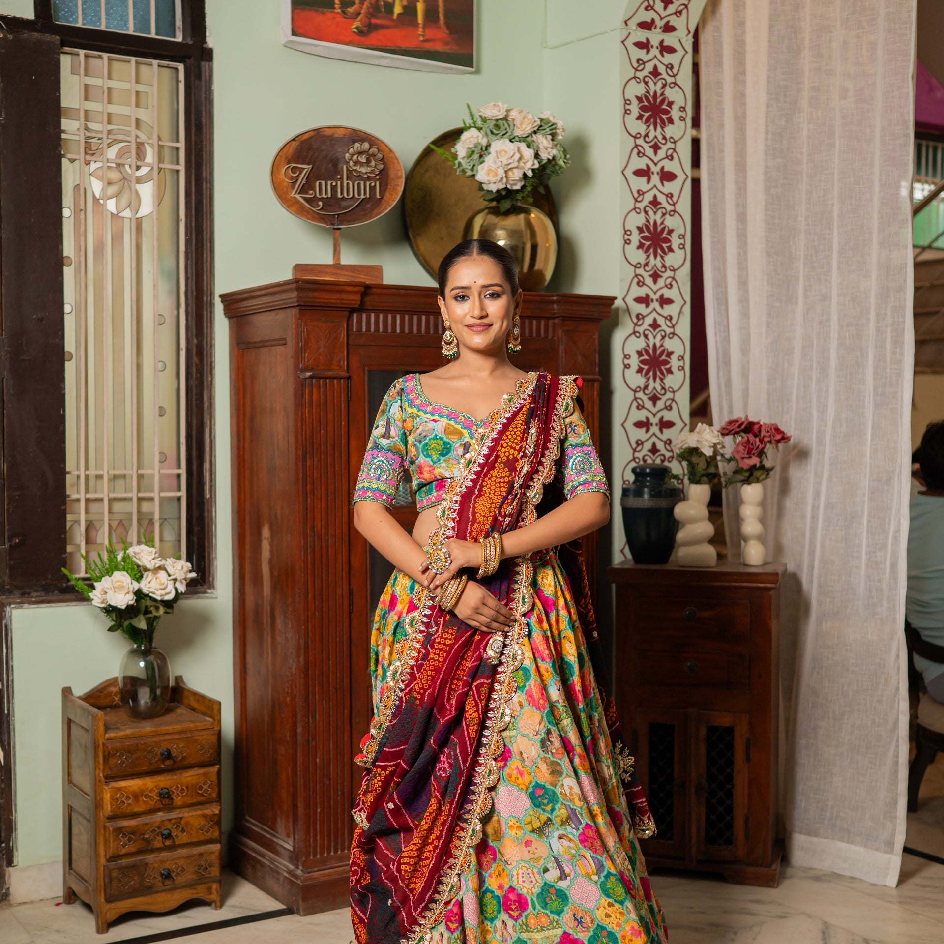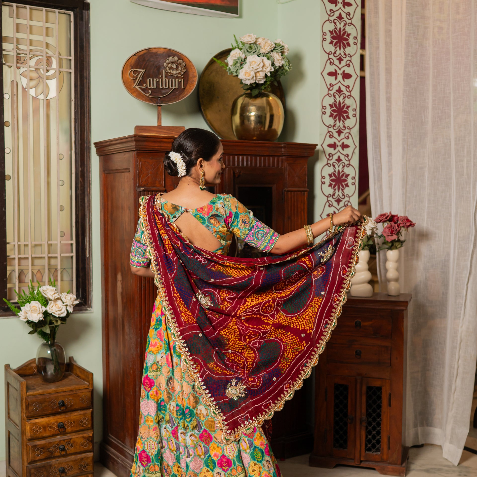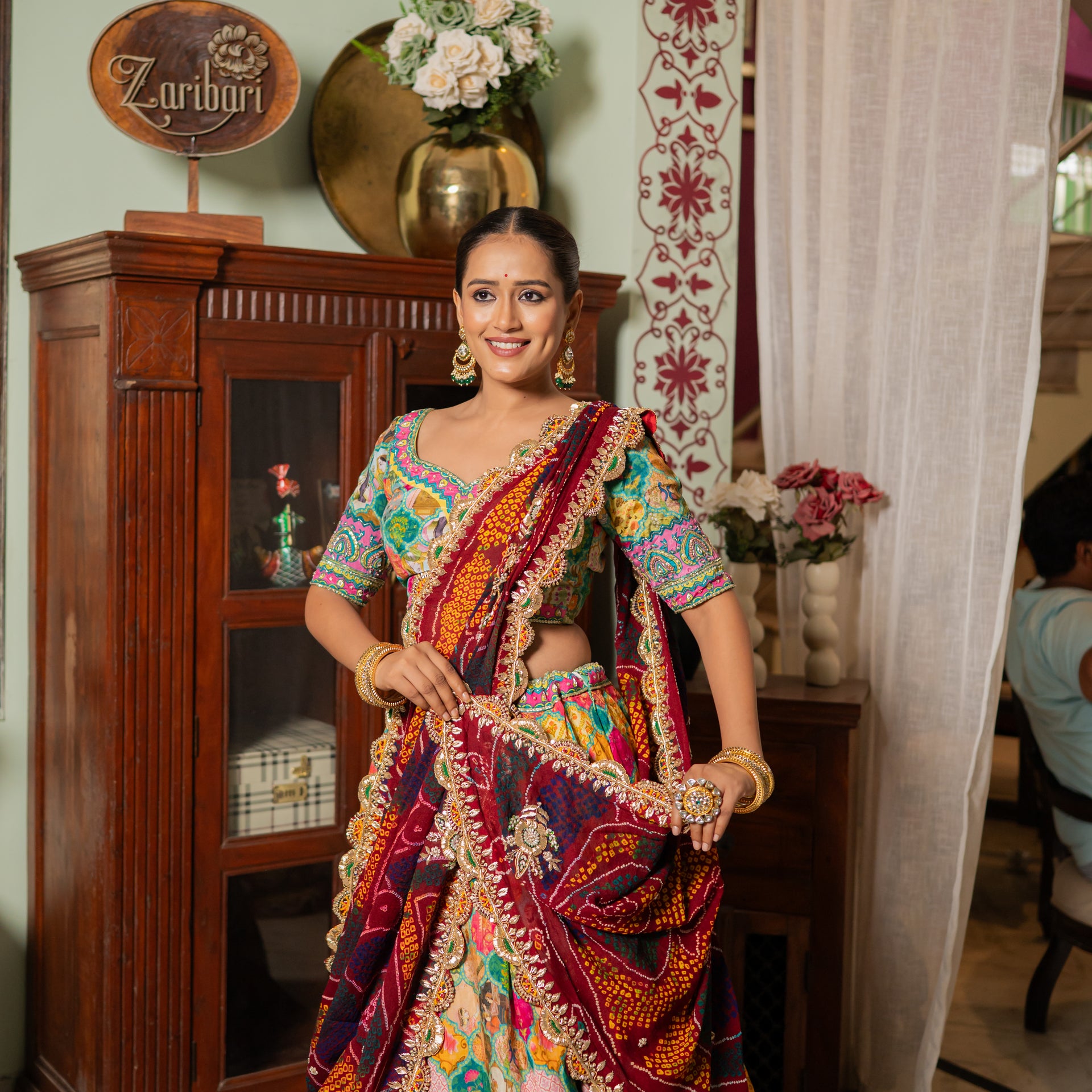 The beautiful Bandhej (or Bandhani) chunari is crafted from pure Ojariya silk, offering a refined drape and a subtle sheen. The rich red hue is perfectly complemented by intricate hand-done Zardozi, thread, kardana, and sequins work. The luxurious handwork creates a brilliant and opulent design, ensuring you make a graceful and memorable entrance. This chunari is a true work of art, perfect for adding a touch of traditional luxury to your outfit.