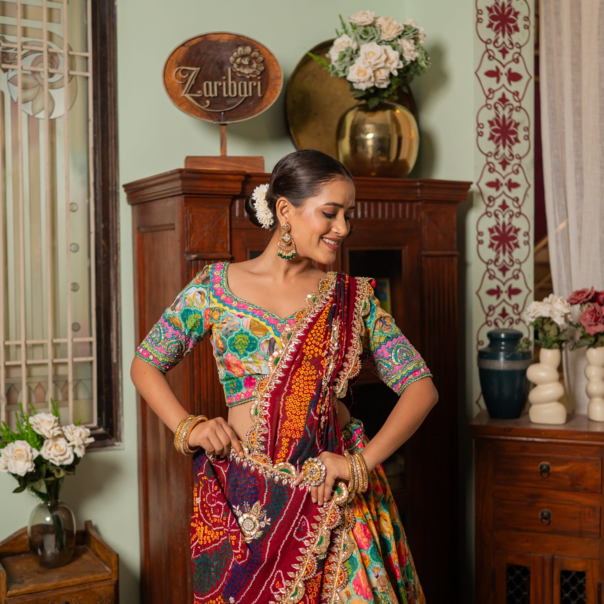 Drape yourself in the timeless elegance of our Red Pure Ojariya Bandhej Chunari. This exquisite piece is a celebration of vibrant color and meticulous craftsmanship, designed to elevate any festive or wedding look.