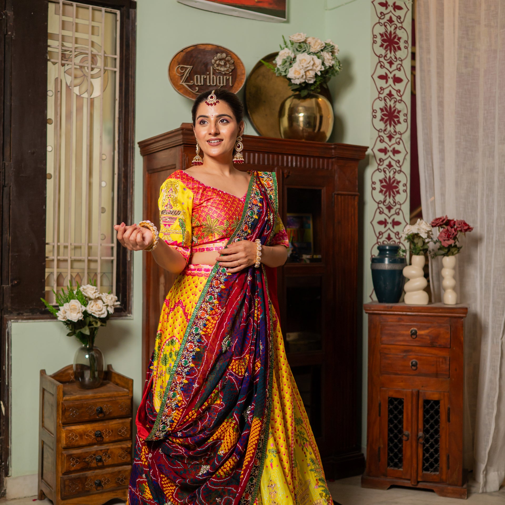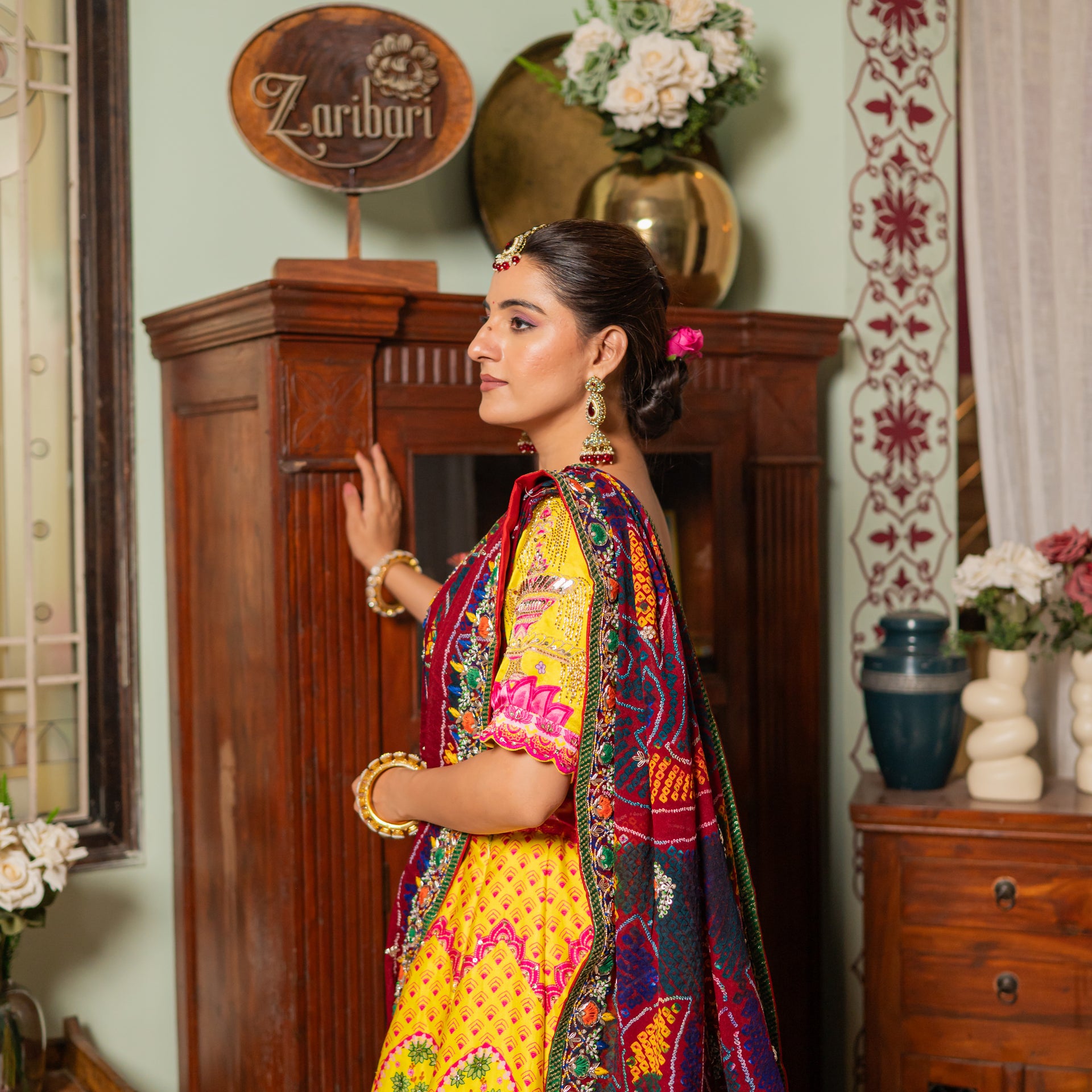 The beautiful Bandhej (or Bandhani) chunari is crafted from pure Ojariya silk, offering a refined drape and a subtle sheen. The rich red hue is perfectly complemented by intricate hand-done Zardozi, thread, pearl, and sequins work. The luxurious handwork creates a brilliant and opulent design, ensuring you make a graceful and memorable entrance. This chunari is a true work of art, perfect for adding a touch of traditional luxury to your outfit.
