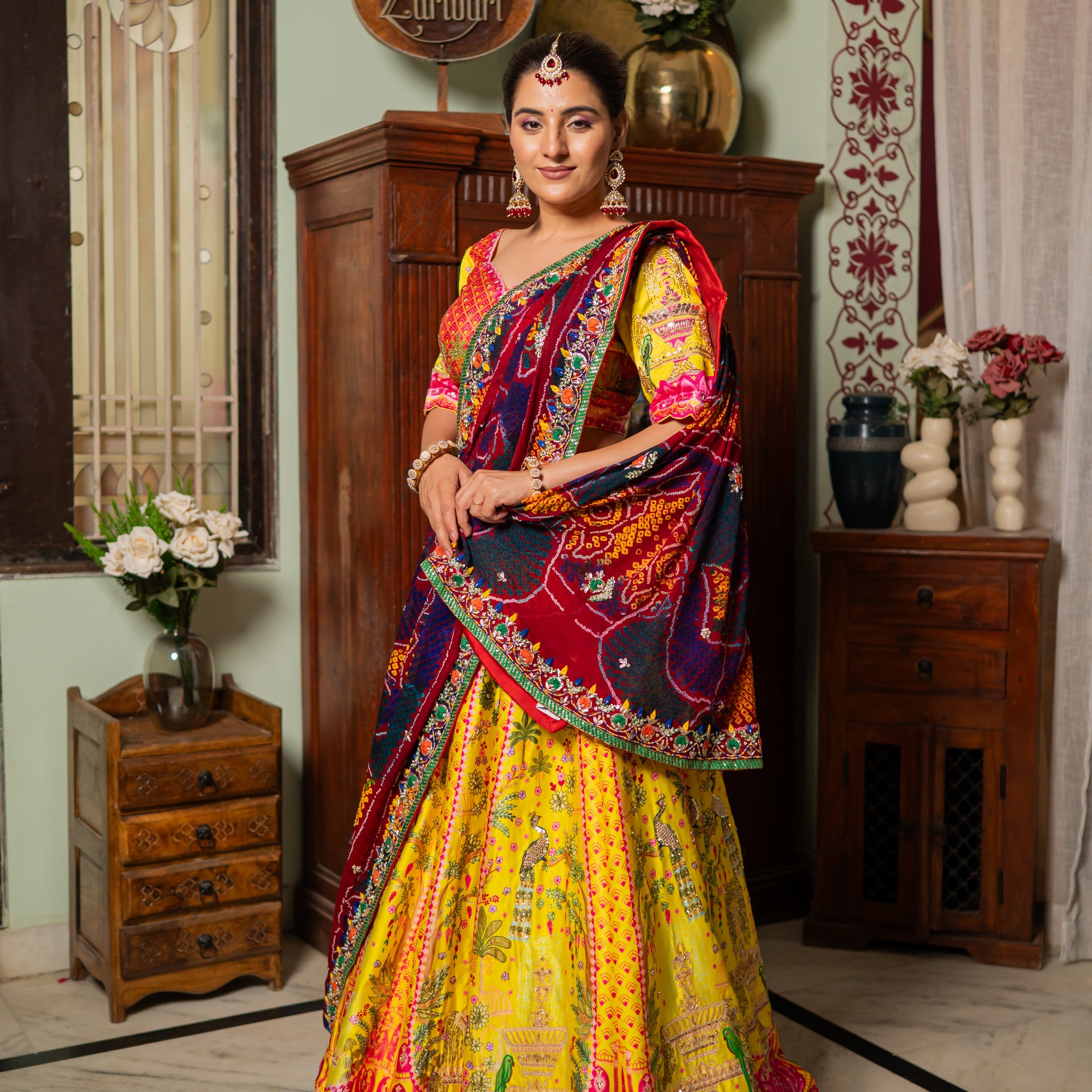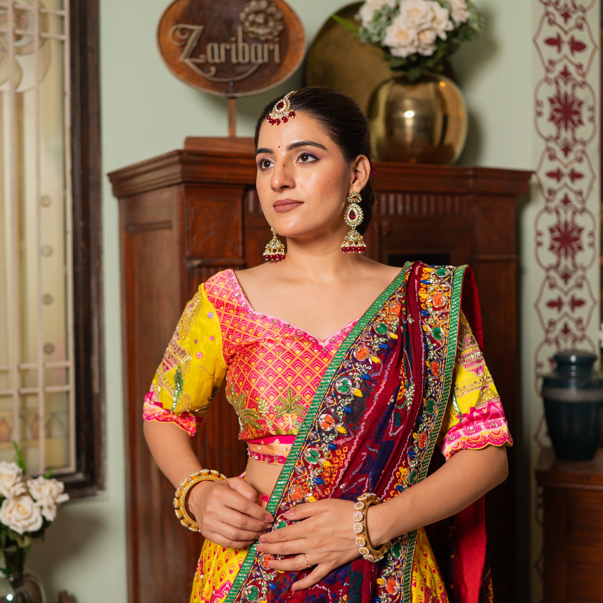 Drape yourself in the timeless elegance of our Red Pure Ojariya Bandhej Chunari. This exquisite piece is a celebration of vibrant color and meticulous craftsmanship, designed to elevate any festive or wedding look.