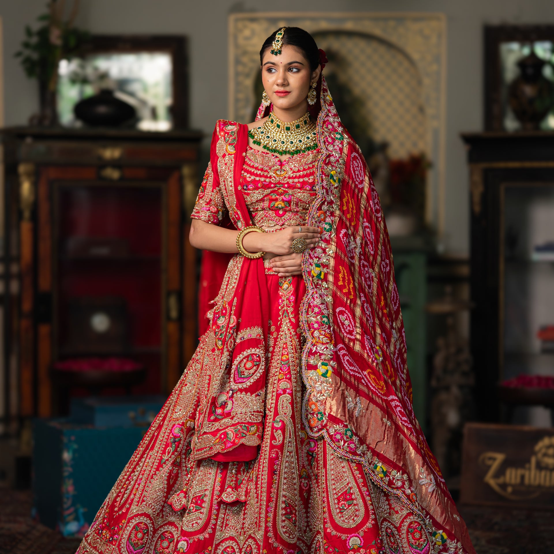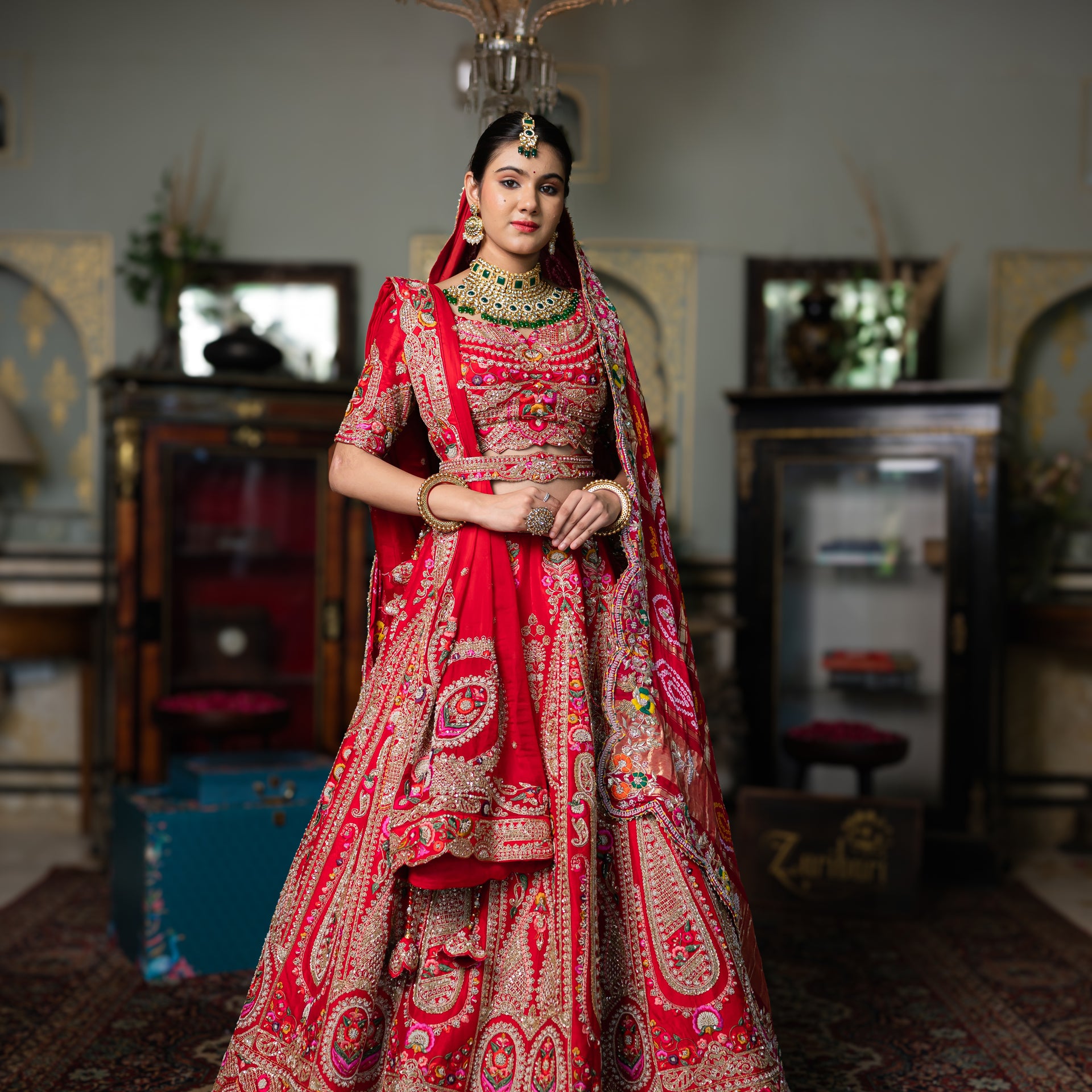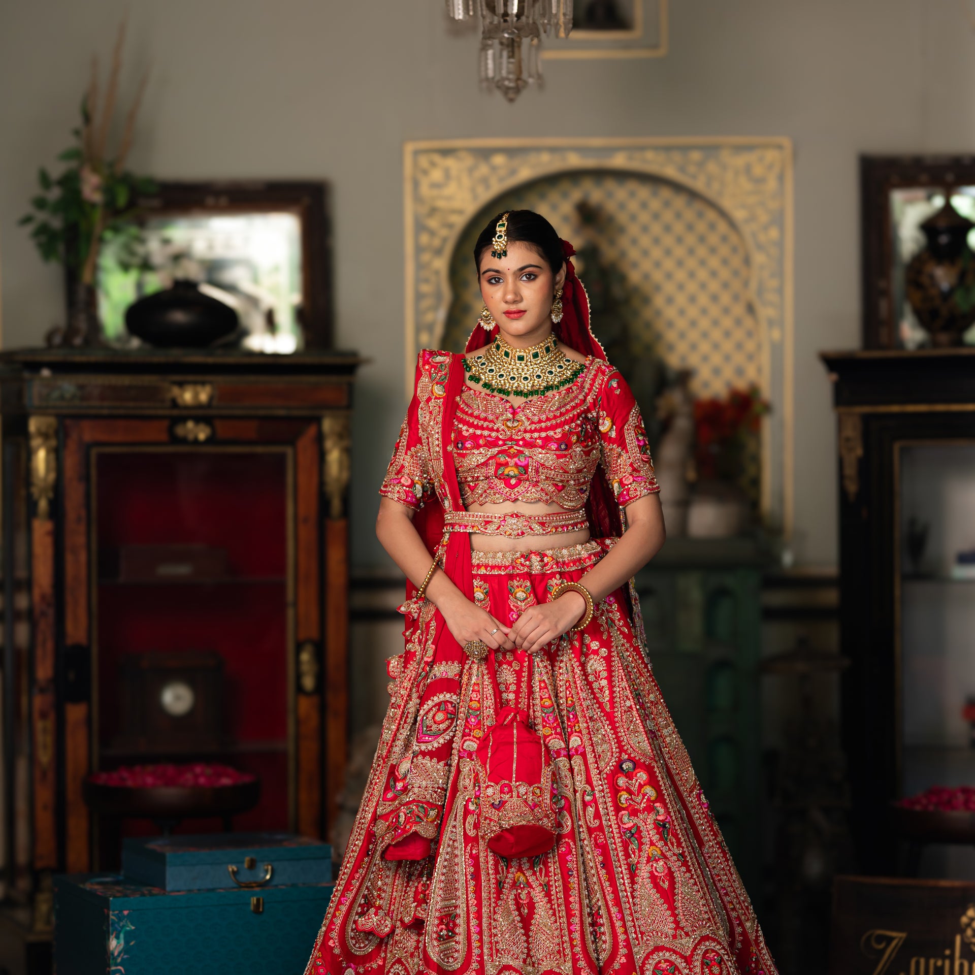 Make a grand entrance on your wedding day in our breathtaking Red Raw Silk Bridal Lehenga. This exquisite ensemble is a true work of art, designed for the bride who wants to blend traditional splendor with timeless elegance. The complete set includes a matching blouse and dupatta, offering a perfect, cohesive look for your special day.