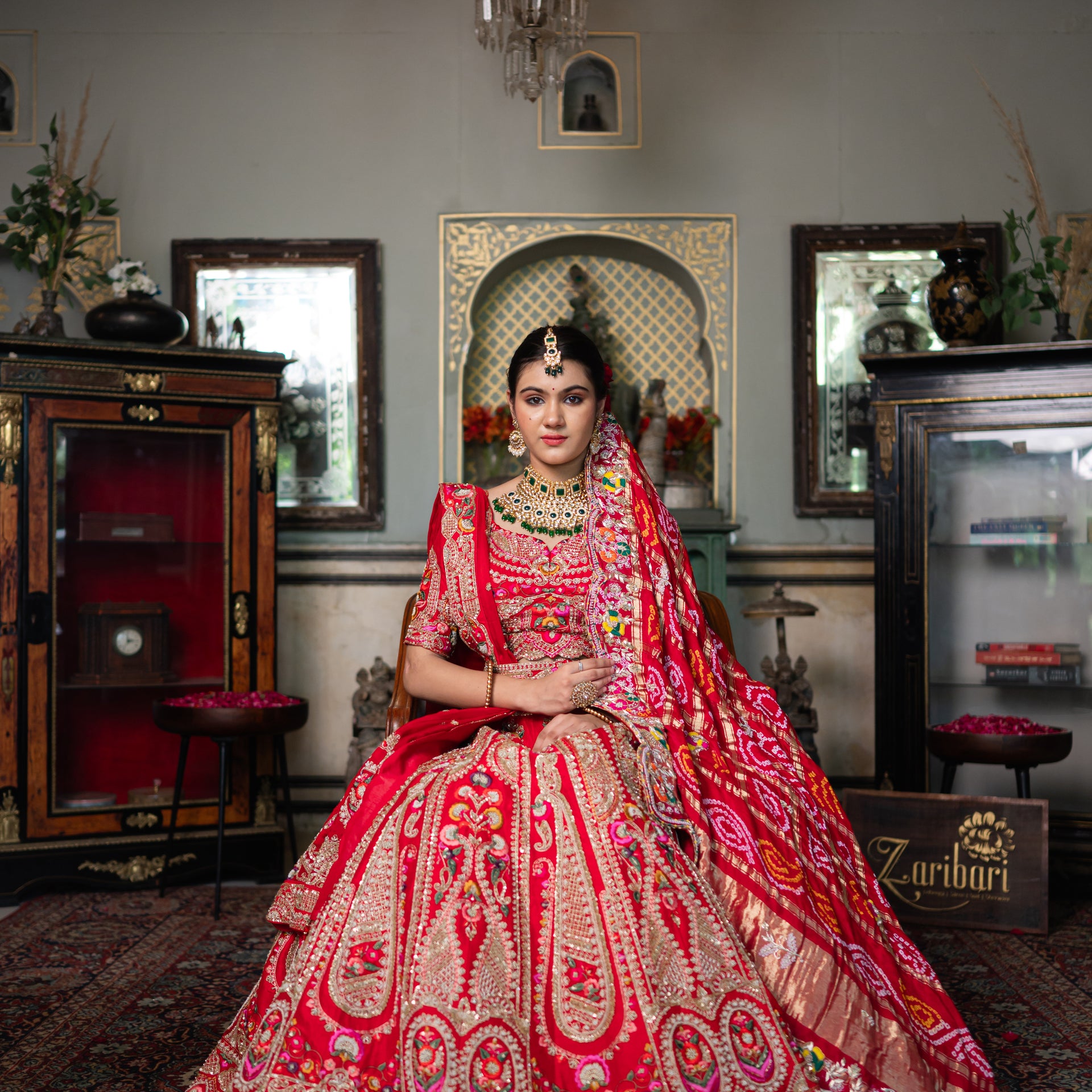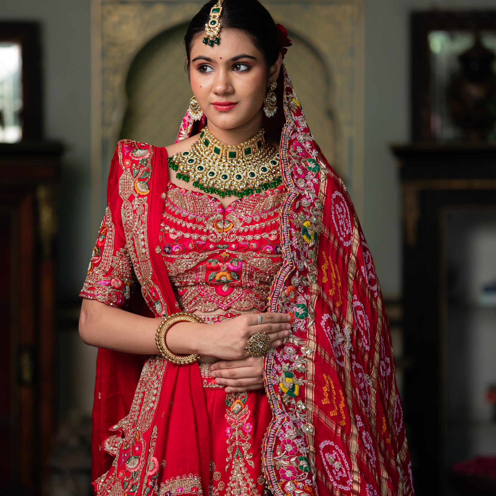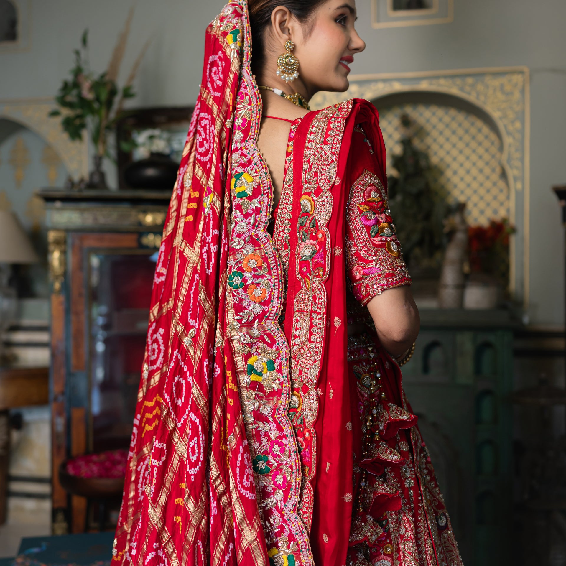 Make a grand entrance on your wedding day in our breathtaking Red Raw Silk Bridal Lehenga. This exquisite ensemble is a true work of art, designed for the bride who wants to blend traditional splendor with timeless elegance. The complete set includes a matching blouse and dupatta, offering a perfect, cohesive look for your special day.