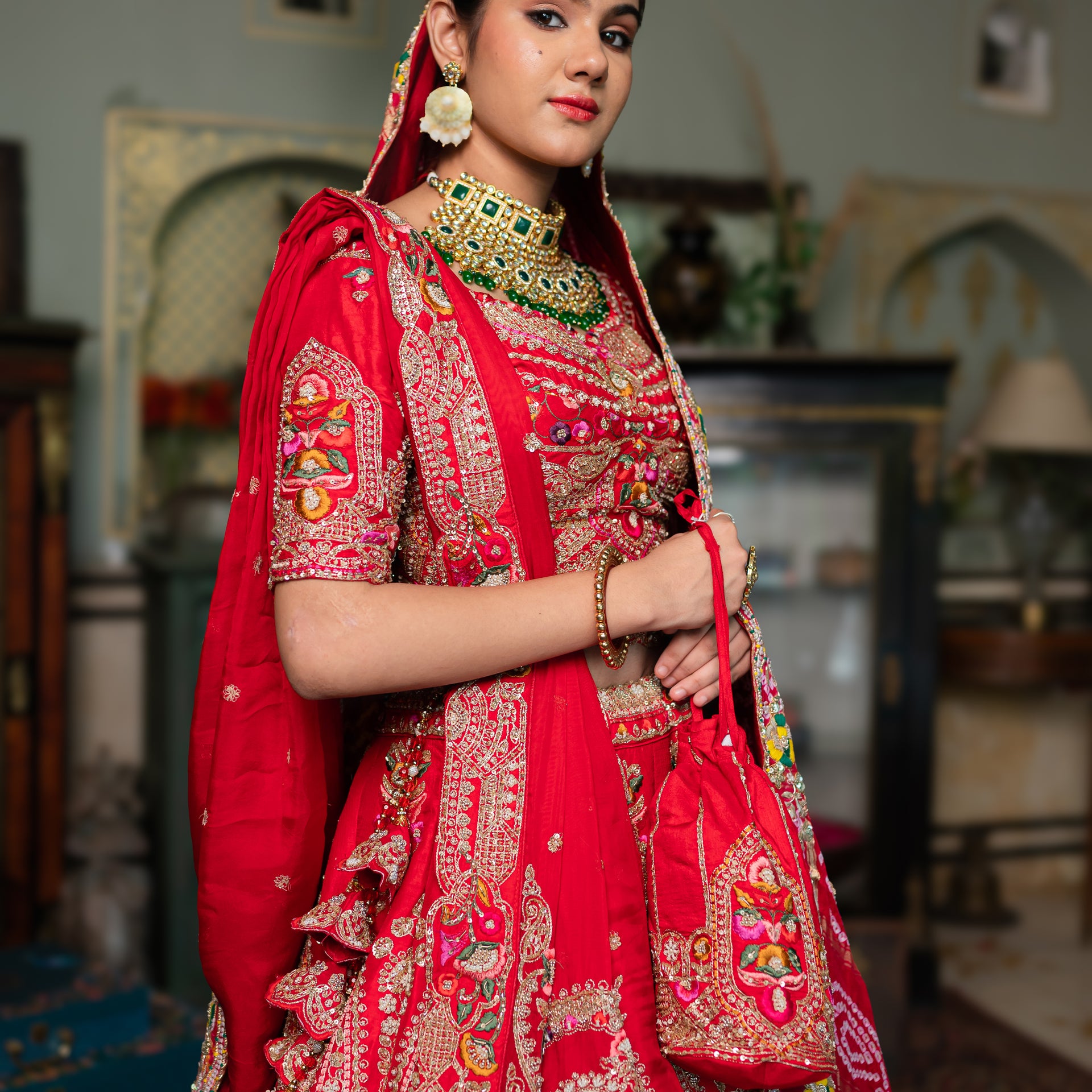 Crafted from luxurious raw silk, the lehenga offers a beautiful texture and an elegant drape. The classic red hue is beautifully complemented by meticulous hand-done Embroidery, Aari, and sequins work. The intricate handwork adds a brilliant shimmer and a touch of traditional artistry, ensuring you look and feel like royalty. This stunning bridal lehenga is a celebration of craftsmanship, designed to make you shine on your most special day.