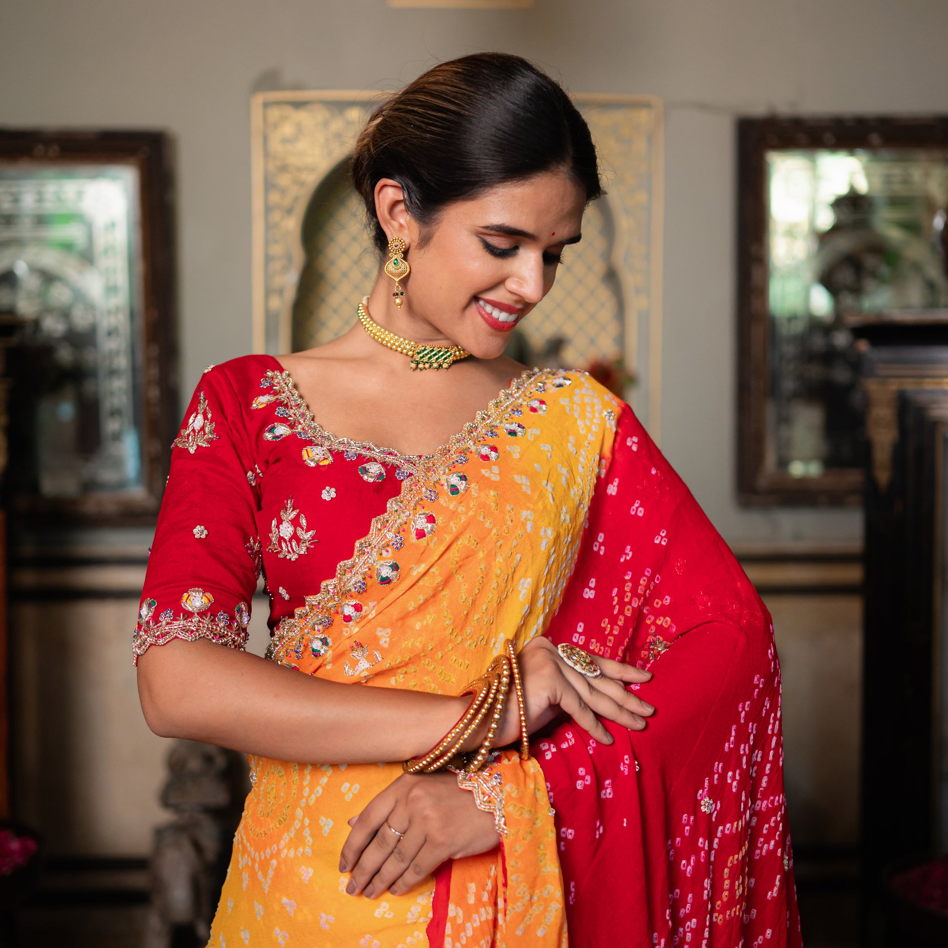 Crafted from luxurious pure georgette, the saree offers a lightweight feel and an elegant drape that flows beautifully. The stunning red and yellow shading creates a dynamic and eye-catching ombre effect, while the intricate hand-done Marodi, sequins, Kardana, and Moti work adds a brilliant shimmer and delicate texture. This saree is a timeless piece that blends traditional artistry with a radiant, modern appeal, ensuring you look effortlessly graceful and beautiful.