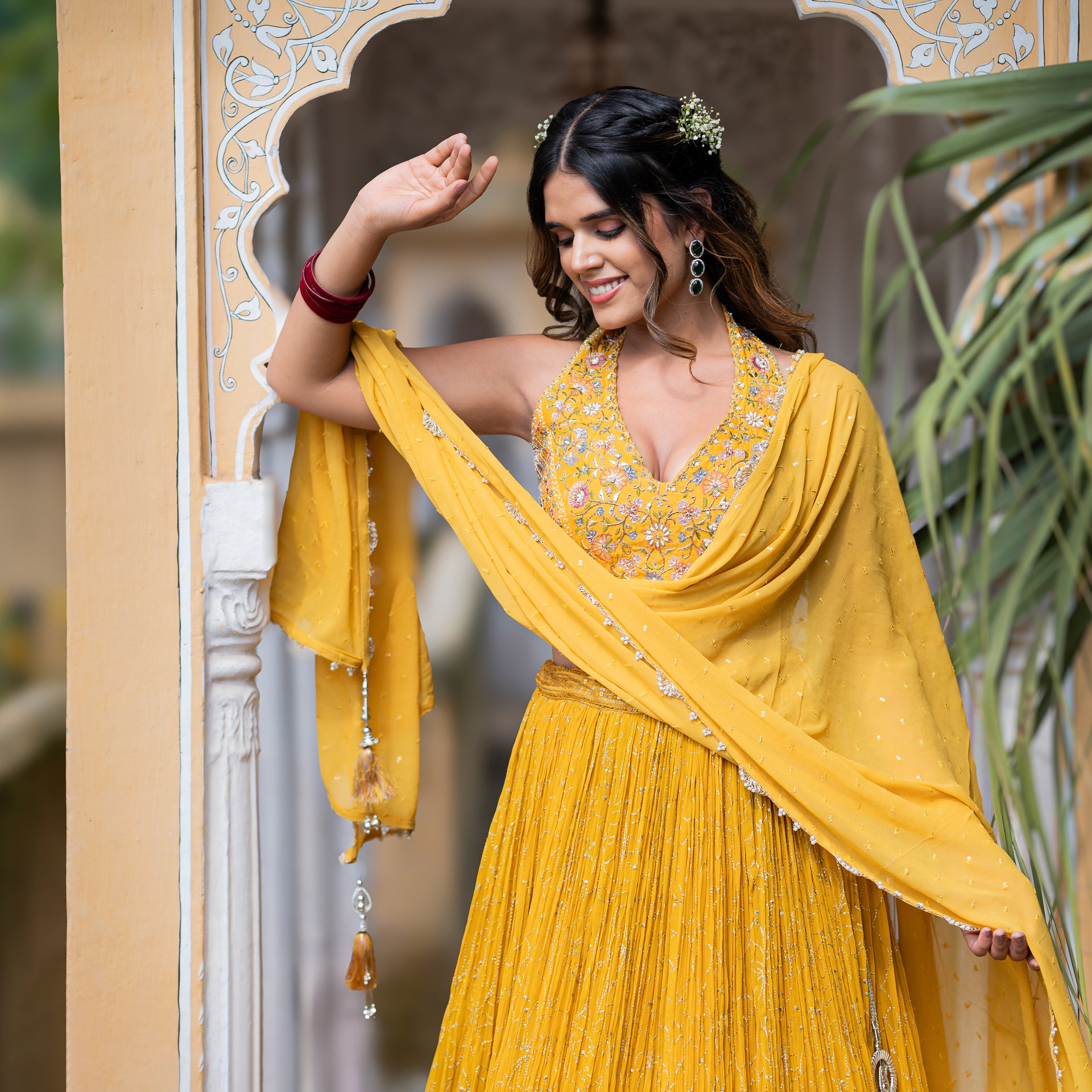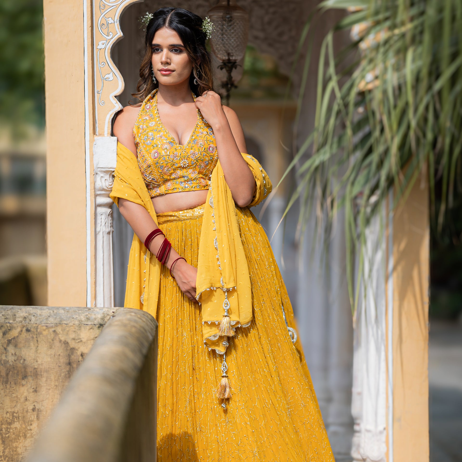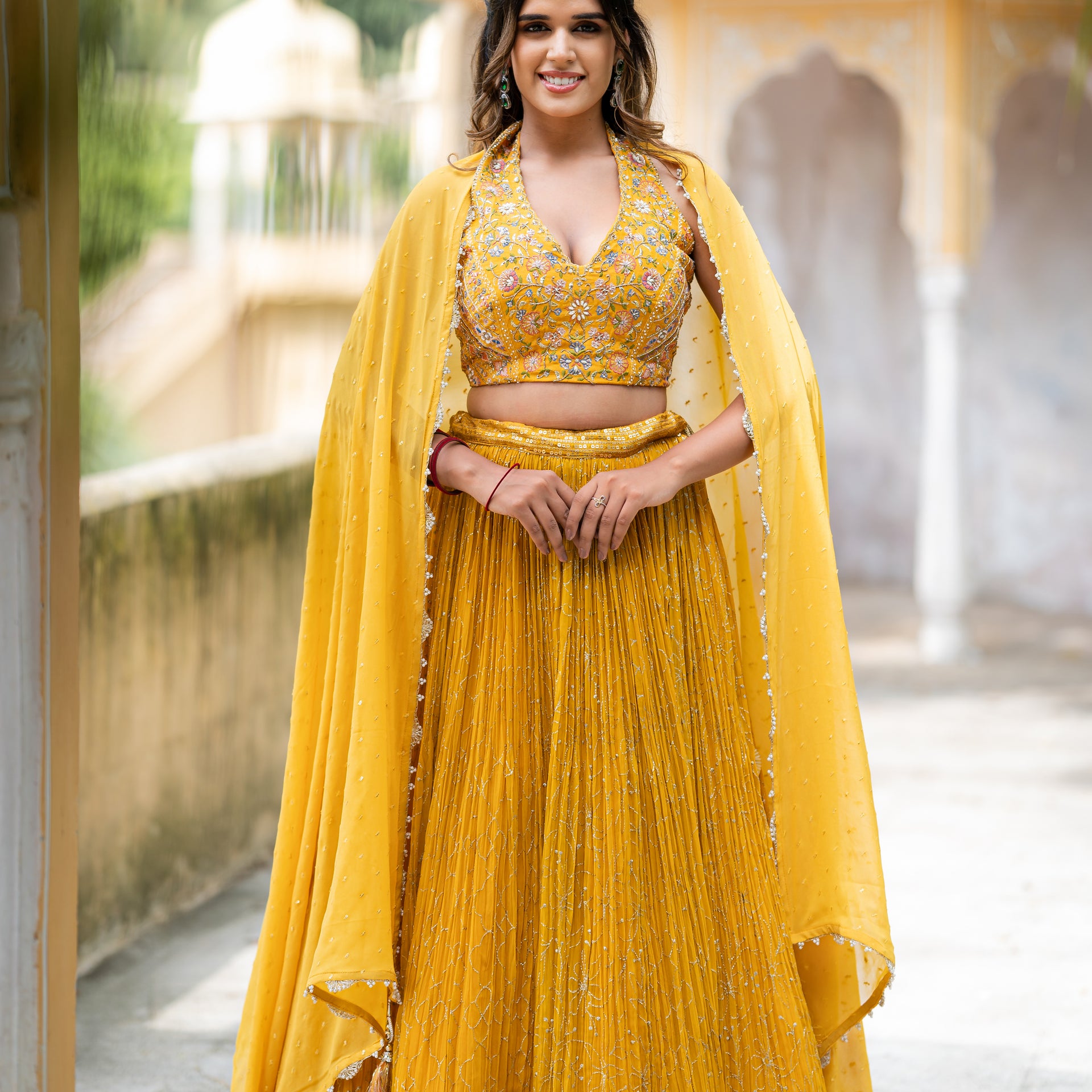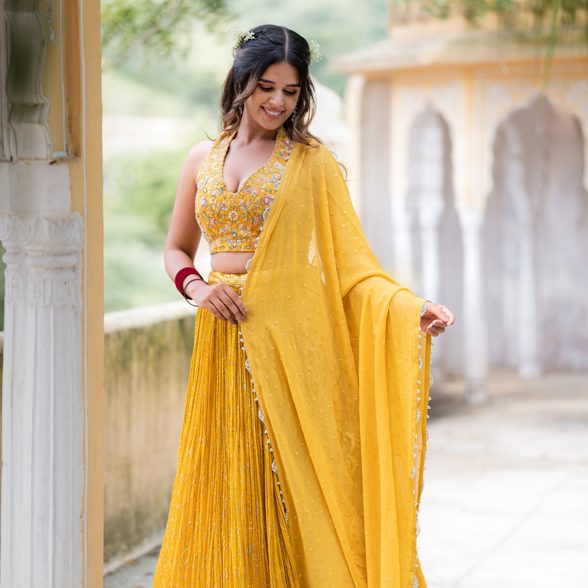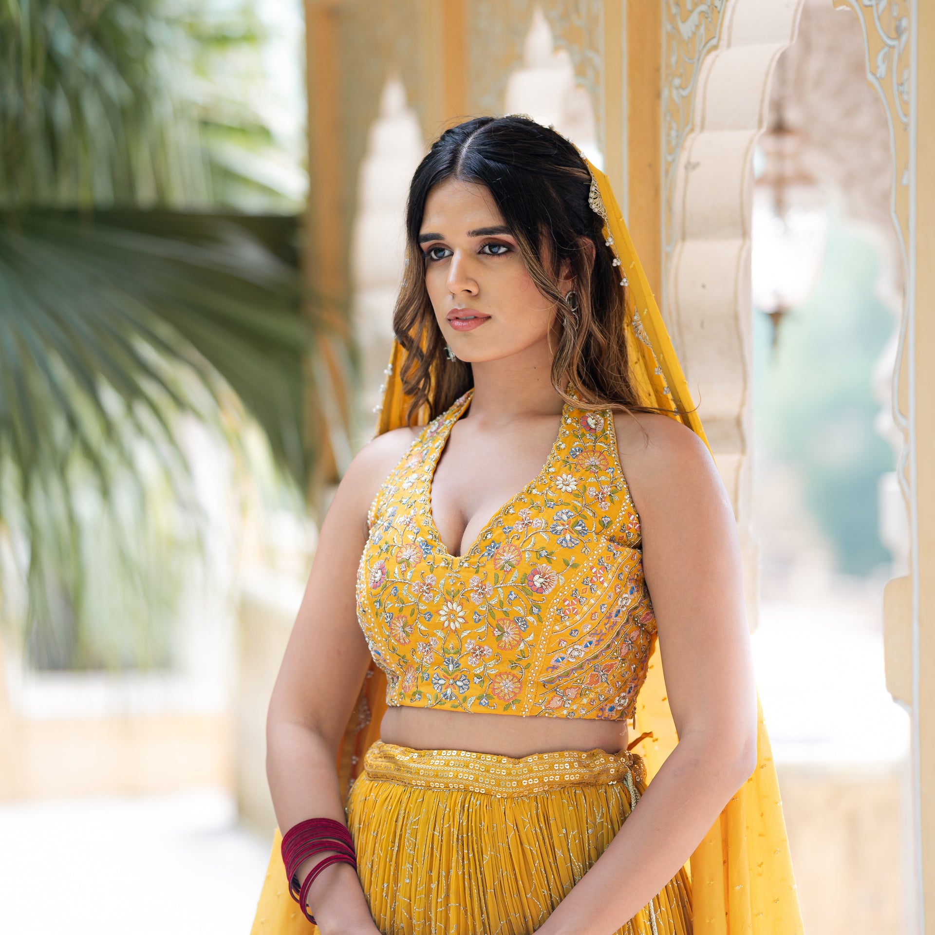 Crafted from luxurious Chinon fabric, this lehenga offers a beautiful drape and a refined satin sheen that radiates sophistication. The rich gold hue is beautifully complemented by meticulous hand-done Aari and sequins work. The intricate embroidery adds a brilliant shimmer and a touch of traditional artistry, ensuring you look and feel effortlessly graceful and radiant on your special day.