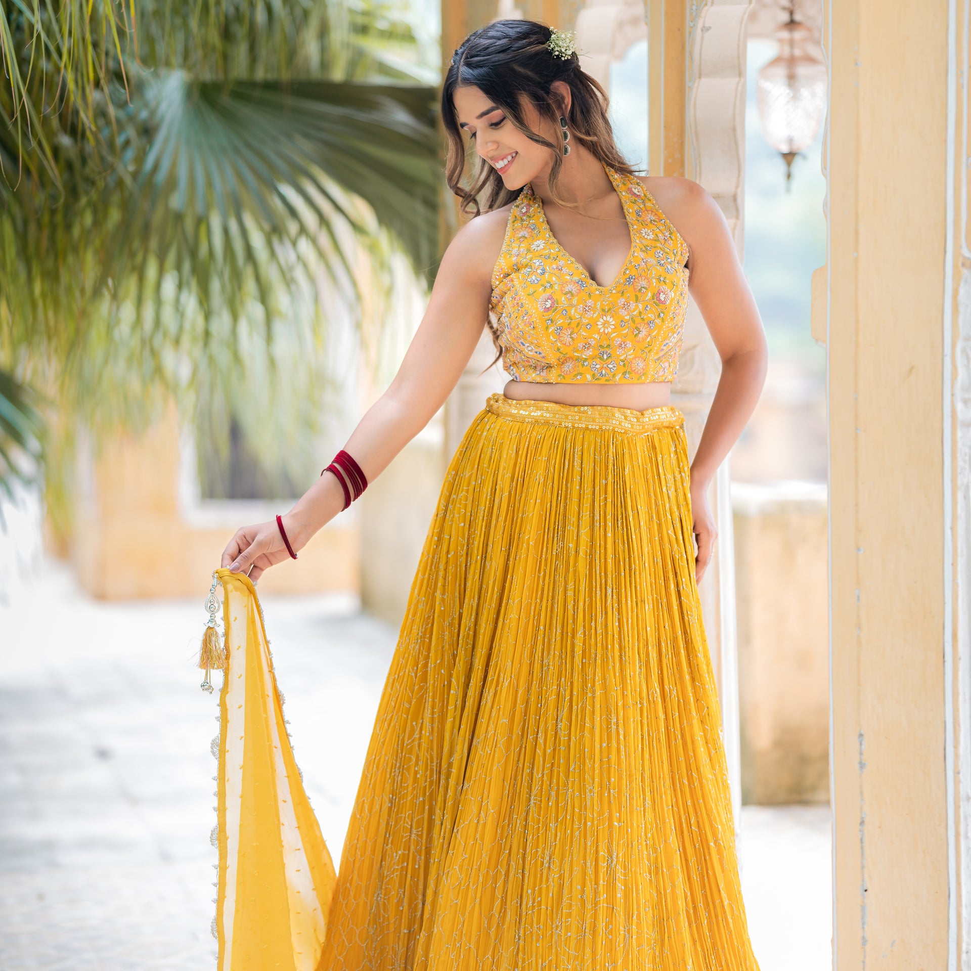 Make a grand entrance in our stunning Satin Sheen Gold Chinon Lehenga, a masterpiece that embodies timeless elegance and contemporary style. This complete three-piece set, featuring a matching blouse and dupatta, is a perfect choice for weddings, receptions, and grand celebrations.