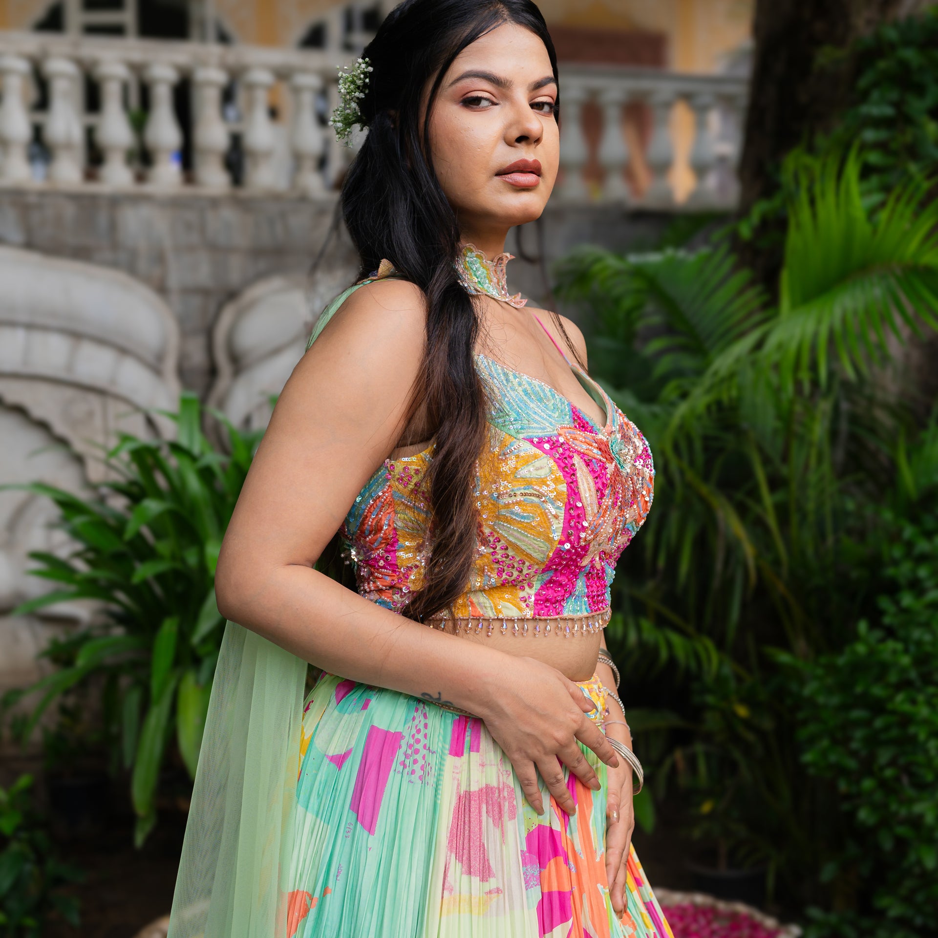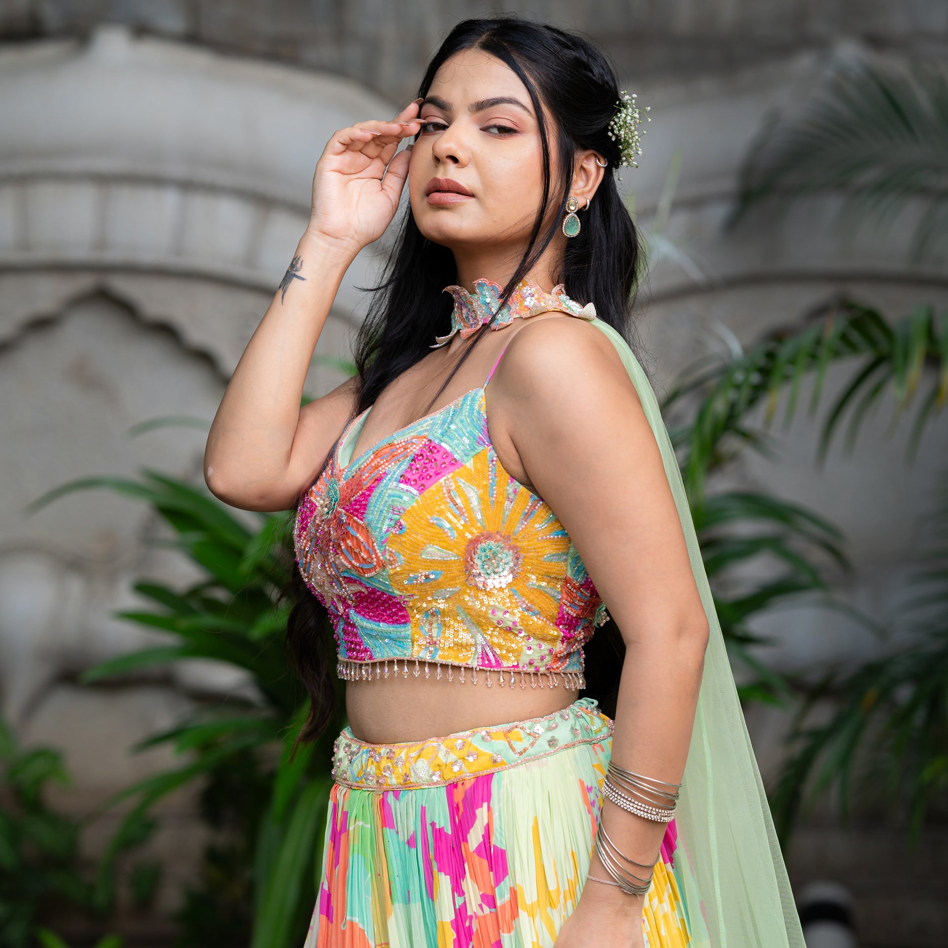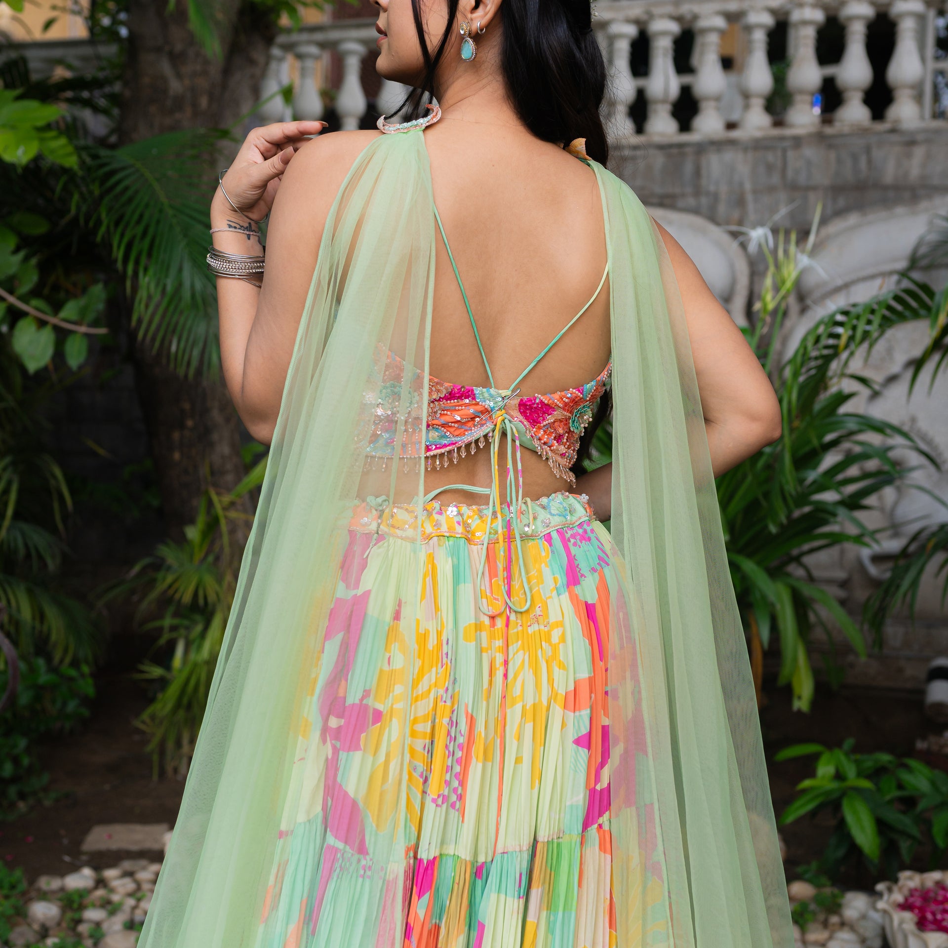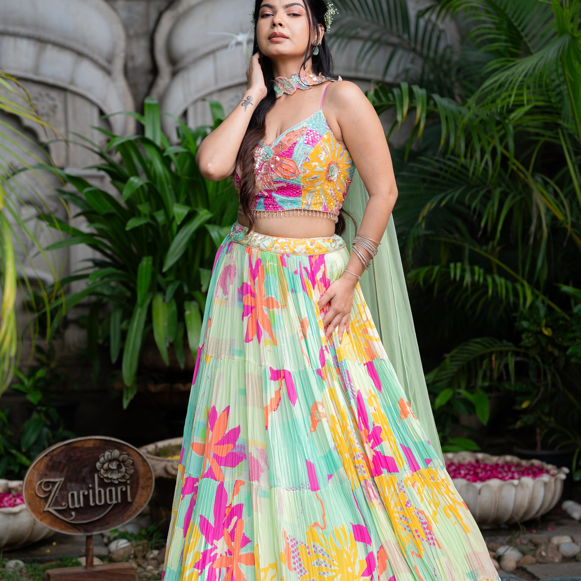 Crafted from luxurious Muslin fabric, the ensemble offers a refined drape and a subtle sheen. The beautiful turquoise green hue is gracefully complemented by a vibrant digital print. The entire piece is beautifully enhanced with delicate sequins work that adds a brilliant shimmer and a touch of glamour. This set is a true work of art, ensuring you look effortlessly graceful and radiant on your special day.