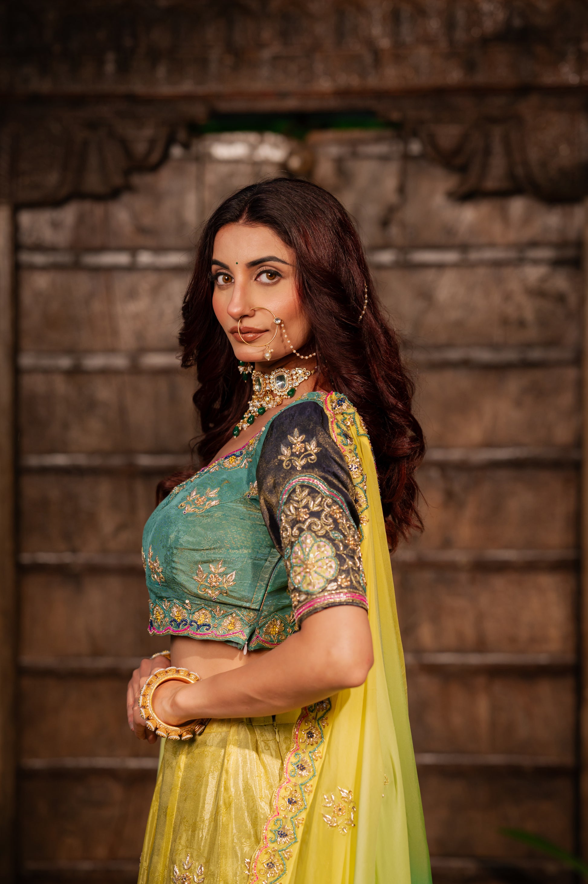 Radiate pure sunshine and elegance in our stunning Yellow Parrot Green Shaded Crepe Lehenga. This exquisite three-piece set, featuring a matching blouse and dupatta, is a true masterpiece of craftsmanship, perfect for weddings, sangeets, and festive celebrations.